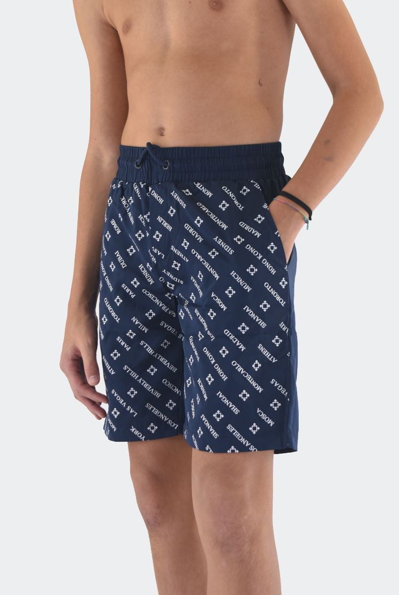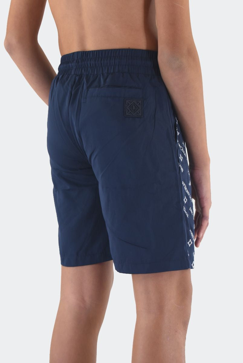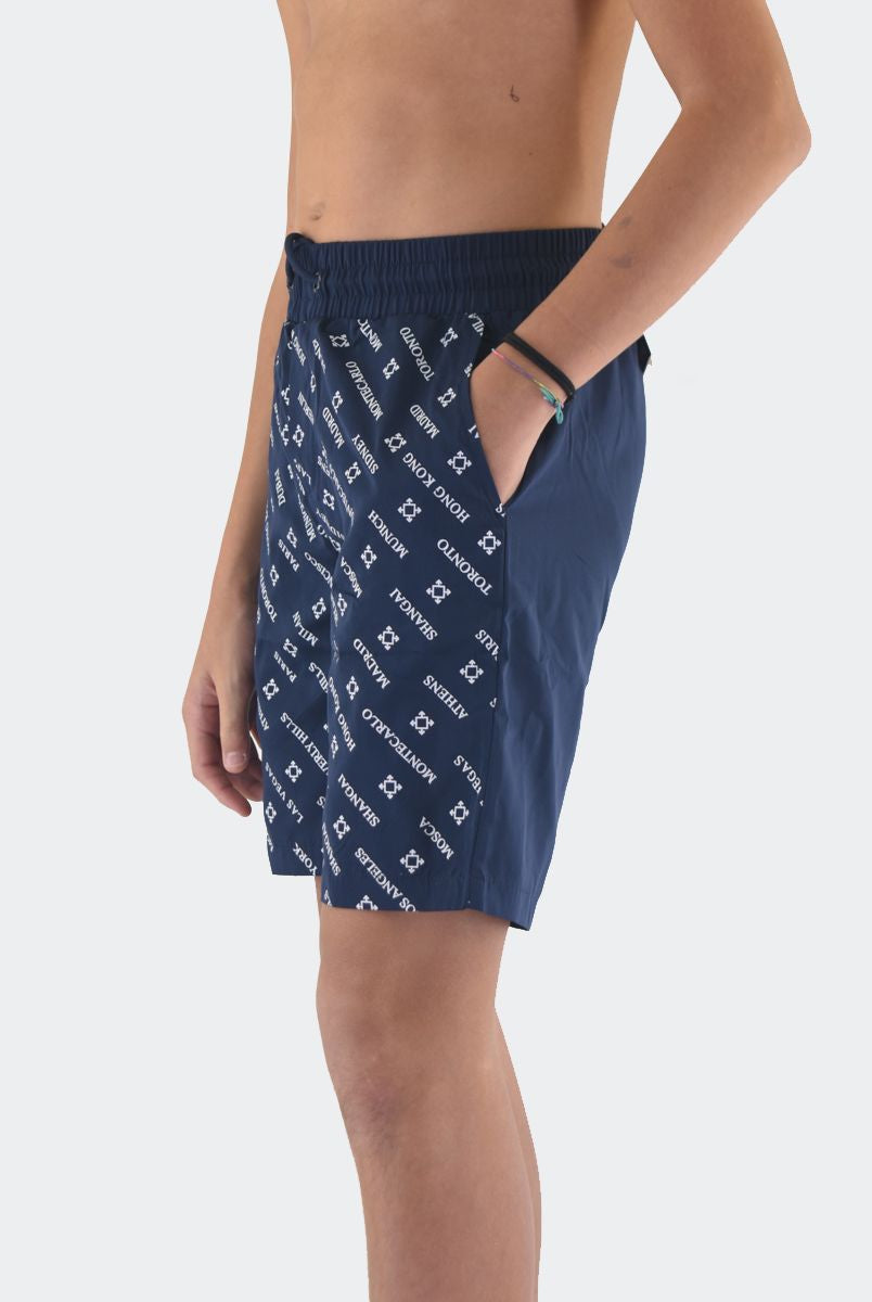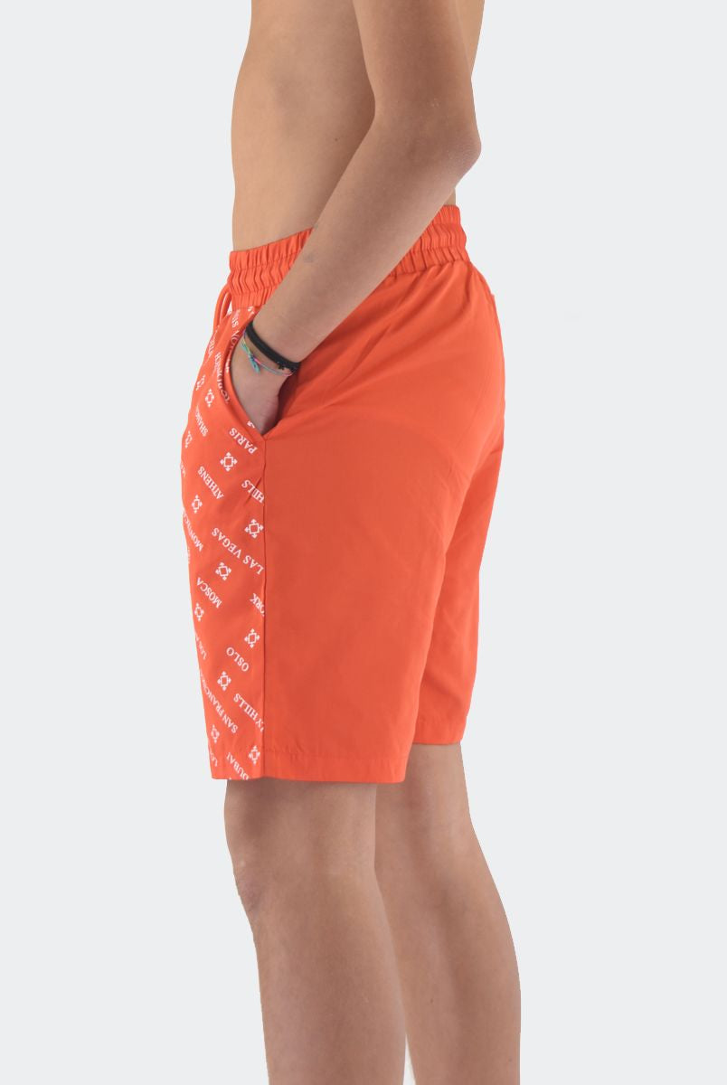 Costume Boxer in tessuto Bicolore con Patch logo in silicone sul fondo. Tasche laterali invisibili e girovita con elastico regolabile da cordino. Rete interna e QrCode Logo stampato