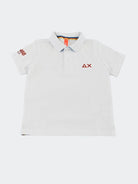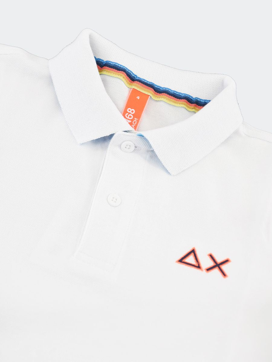 Polo estiva da Ragazzo Polo Sun68 con logo a contrasto colore. Le maniche corte e il collo polo classico la rendono un capo versatile e alla moda. Il colore unito al ricamo del logo sul petto e sulla manica destra conferisce un tocco di eleganza e originalità. La vestibilità slim assicura una silhouette impeccabile. il tessuto piquet di cotone e il sottocollo a contrasto colore sono identificativi del Brand