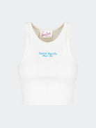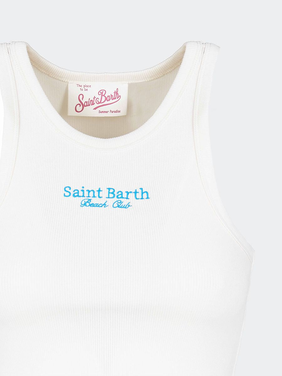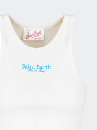 Top tinta unita in tessuto elasticizzato con bordino a contrastocon ricamo St.Barth