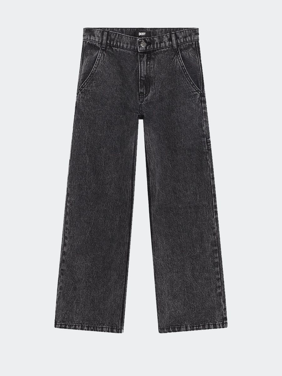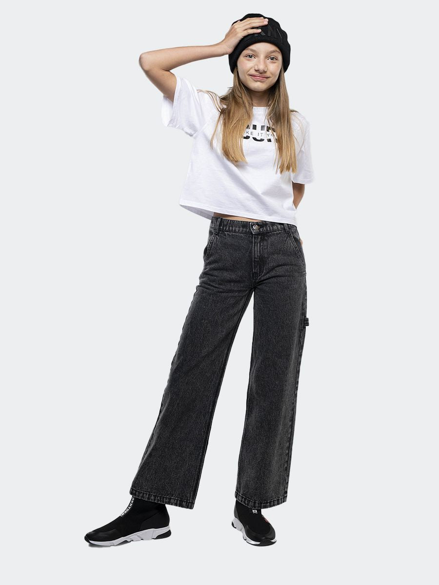 Jeans a palazzo con apertura a bottone. Tasche laterali aperte e riprese sul retro con Logo applicato sulla tasca destra.