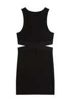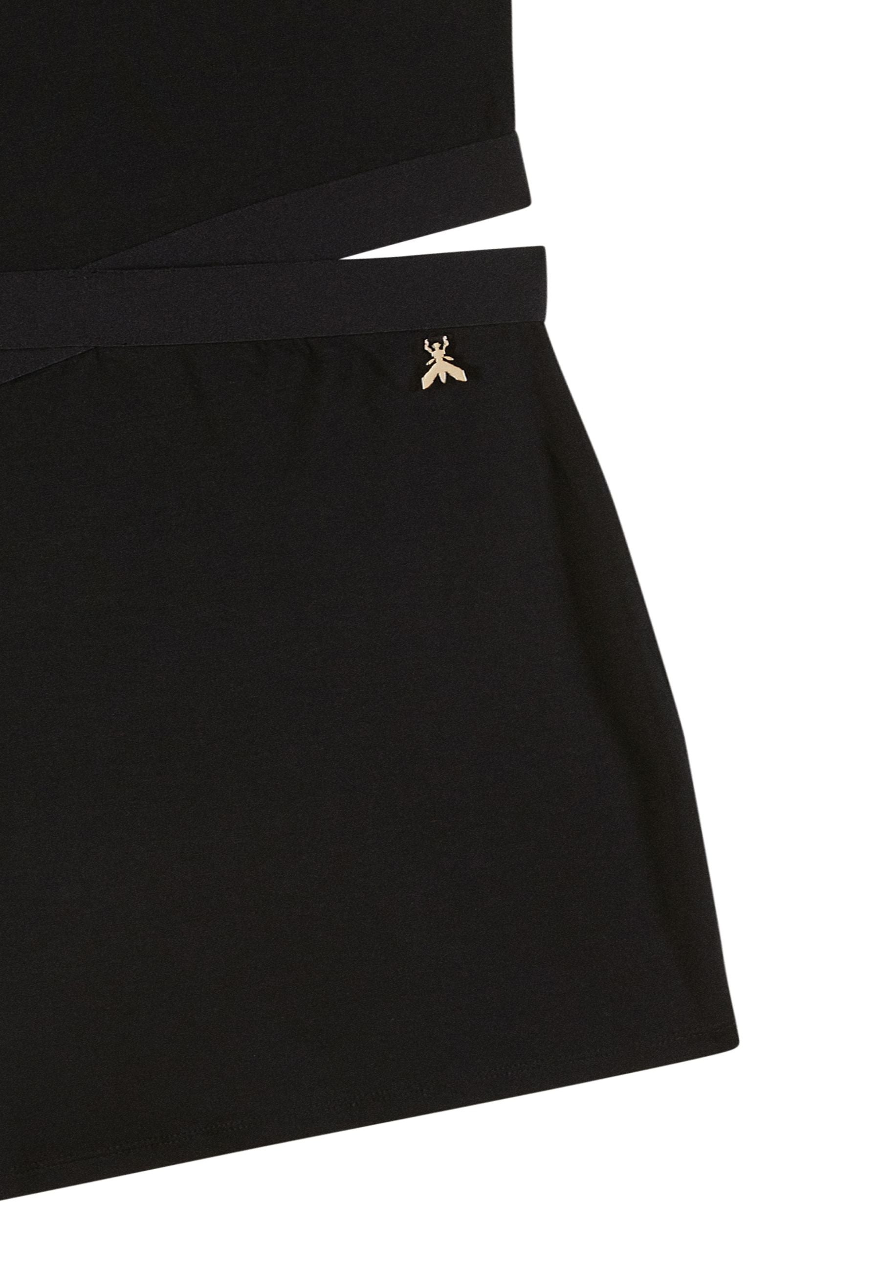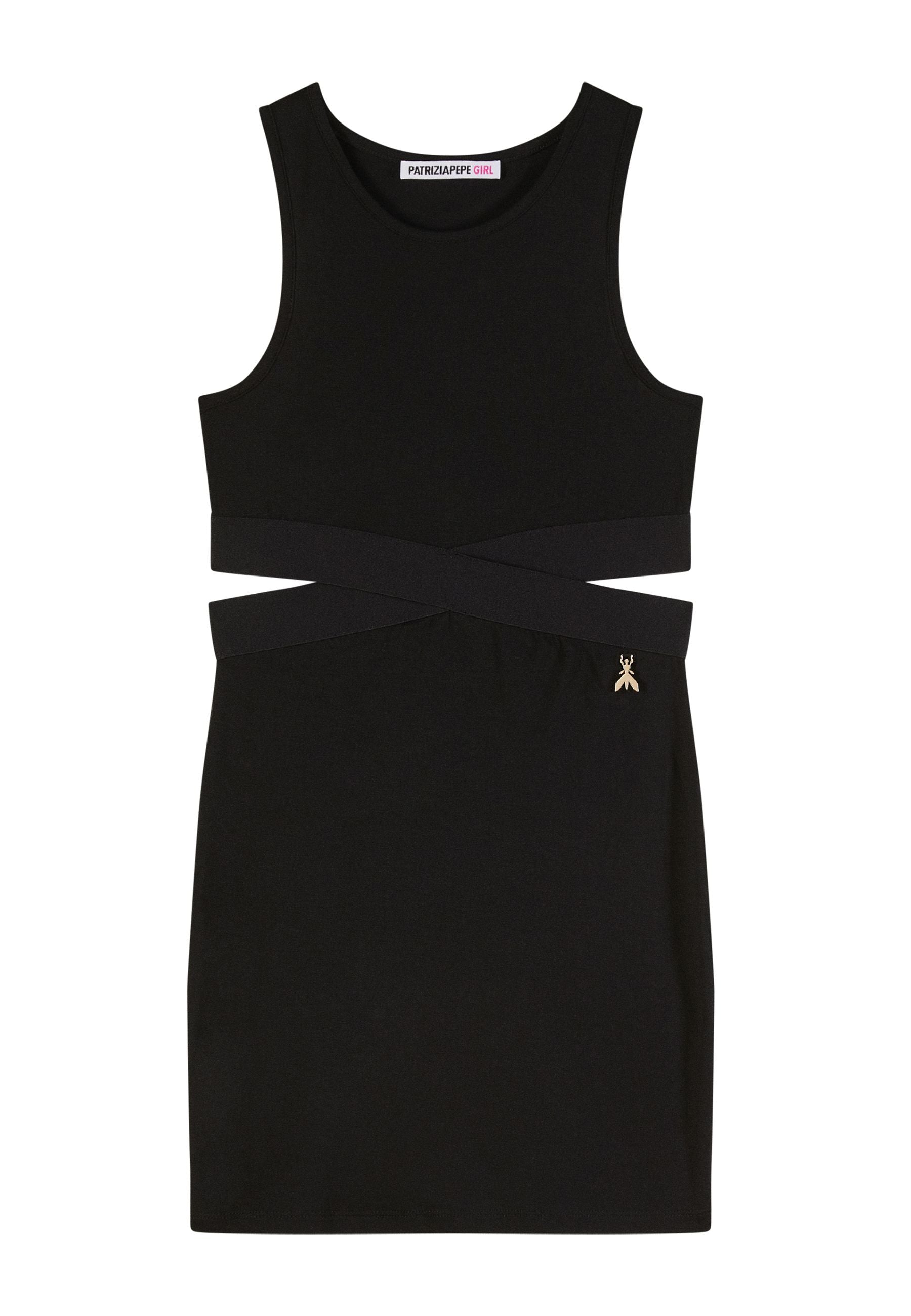 Abito nero cut-out di Patrizia Pepe elegante sofisticato contemporaneo smanicato con inserti laterali e cinghie incrociate raffinato e seducente impreziosito dal piccolo logo a forma di mosca oro simbolo distintivo del brand un capo esclusivo disponibile su Bimbivip partner storico affidabile e riconosciuto in Europa punto di riferimento per famiglie alla ricerca di qualità originalità e garanzia per un’esperienza d’acquisto sicura soddisfacente e appagante