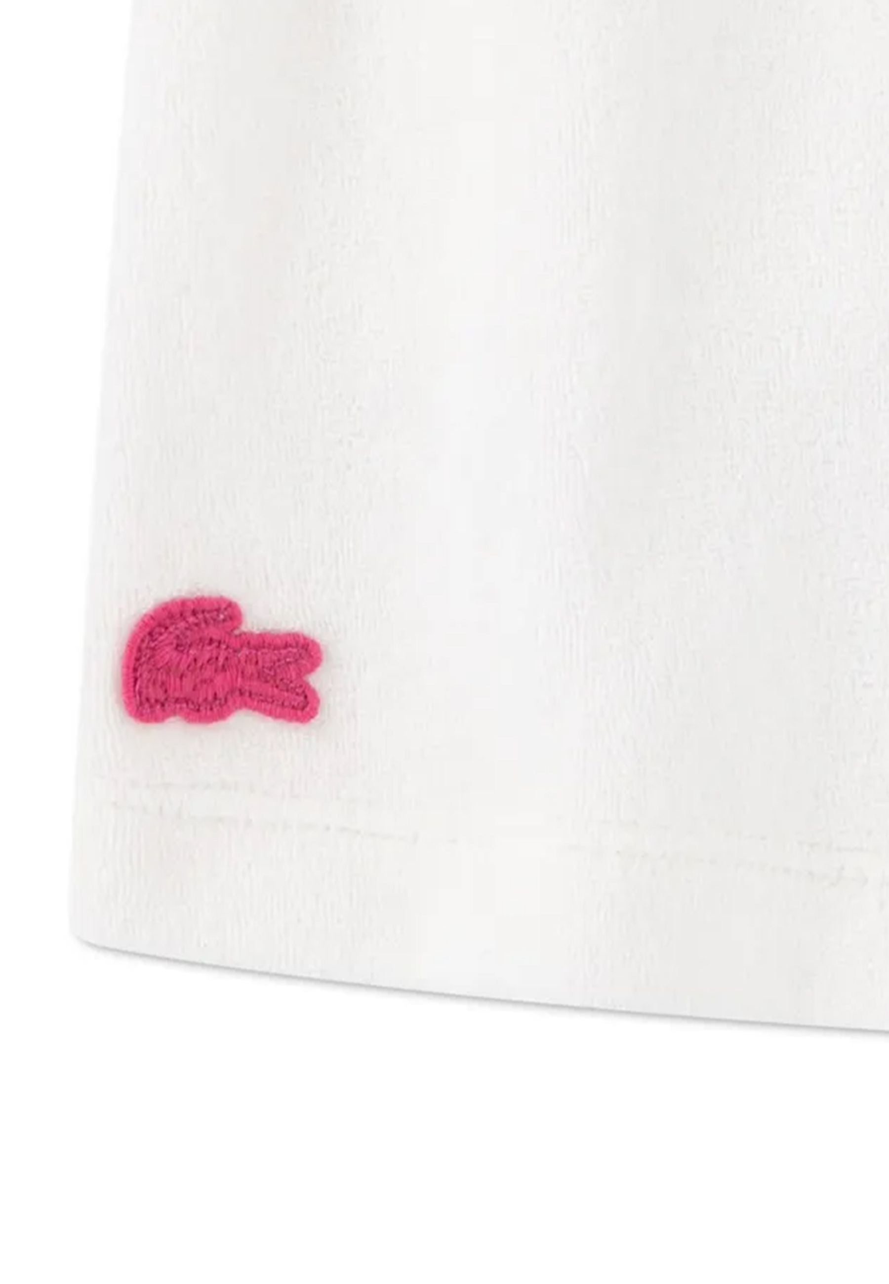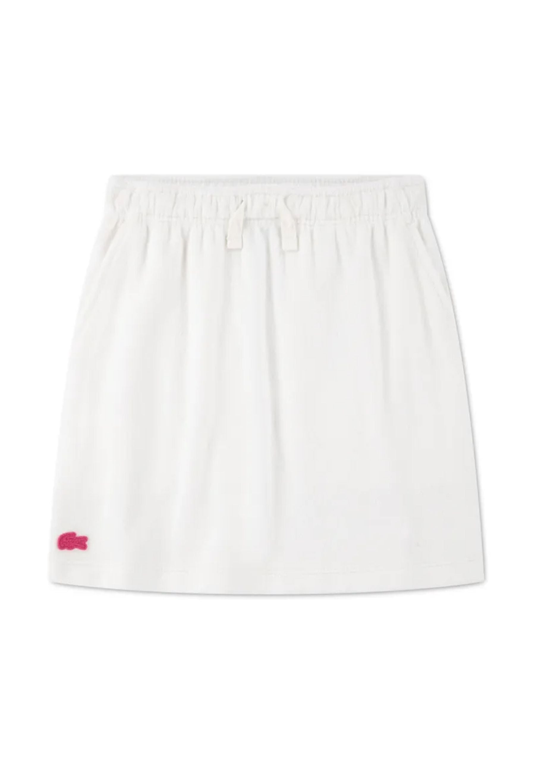 Gonna Lacoste in spugna morbida avvolgente e piacevole al tatto pensata per offrire comfort superiore e stile sportivo raffinato Tessuto ricco e consistente in prevalenza cotone con fibra resistente che mantiene forma e qualità nel tempo Colore bianco luminoso facile da abbinare impreziosito dalliconico coccodrillo rosa ricamato che aggiunge un tocco distintivo e riconoscibile Vita elasticizzata con coulisse regolabile per una vestibilità pratica stabile e confortevole Tasche laterali funzionali dal taglio dinamico che valorizzano il design casual moderno Capo versatile ideale per tempo libero vacanza e quotidianità attiva.Prodotto esclusivo distribuito da Bimbivip partner storico affidabile e riconosciuto nel panorama europeo ecommerce e retail punto di riferimento per le famiglie che cercano qualità autenticità e marchi prestigiosi Garanzia di originalità servizio curato esperienza di acquisto sicura semplice e appagante che valorizza ogni scelta del cliente