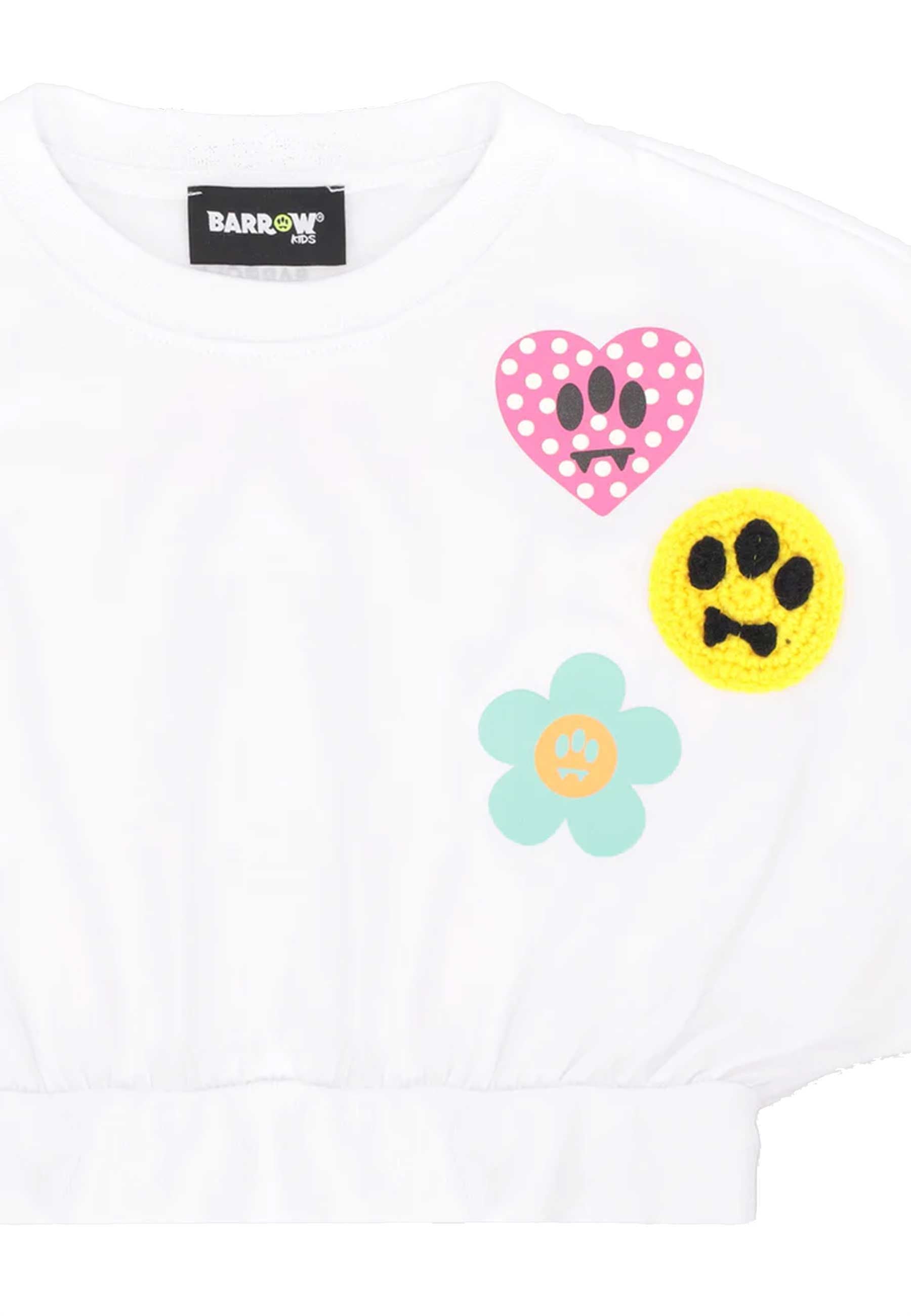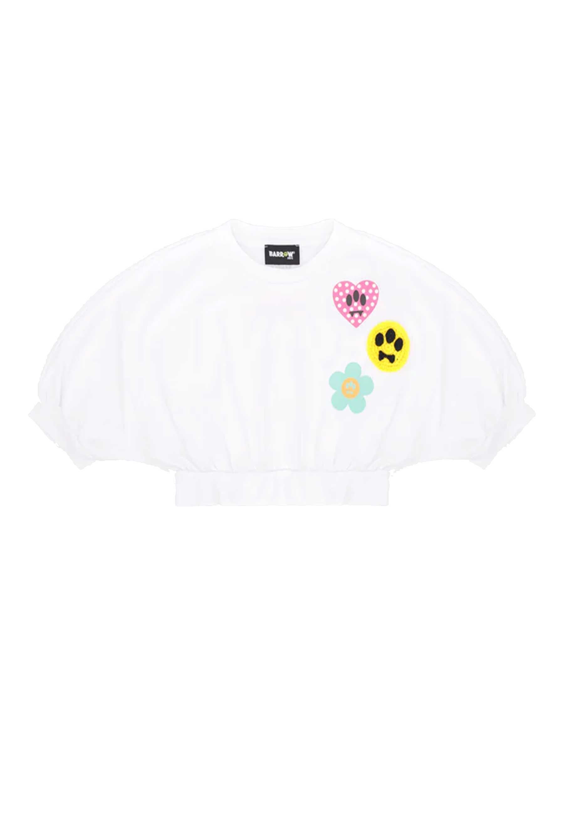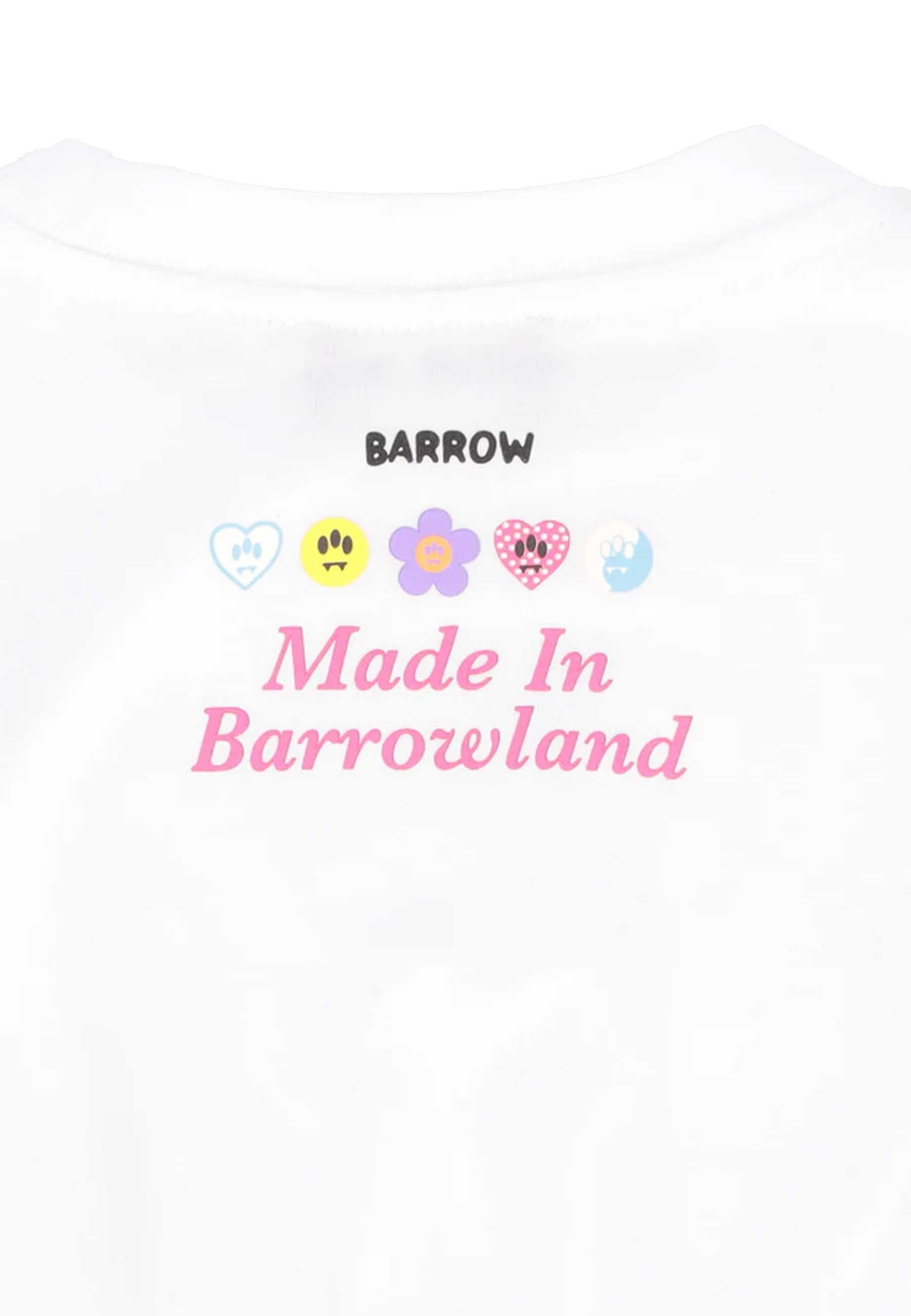 T-shirt girocollo manica corta in morbido jersey di cotone linea cropped dal volume comodo e grafico con patch cuore fiore e smile a tre occhi rilievo effetto maglina retro con lettering multicolor e scritta Made in Barrowland bordi elasticizzati per silhouette compatta elegante e moderna Made in Italy Prodotto esclusivo distribuito da Bimbivip partner storico affidabile e autorevole punto di riferimento per famiglie che cercano qualità autenticità e marchi prestigiosi Bimbivip garantisce acquisto sicuro trasparente e gratificante con cura nella selezione e originalità certificata Shopping sereno e di valore solo prodotti genuini 100% originali controllati dai nostri specialisti scegli con fiducia senza supportare il mercato falso Seguire attentamente le istruzioni di lavaggio riportate sull'etichetta all'interno del capo. made in MADE IN ALBANIA composizione COTONE 100%