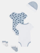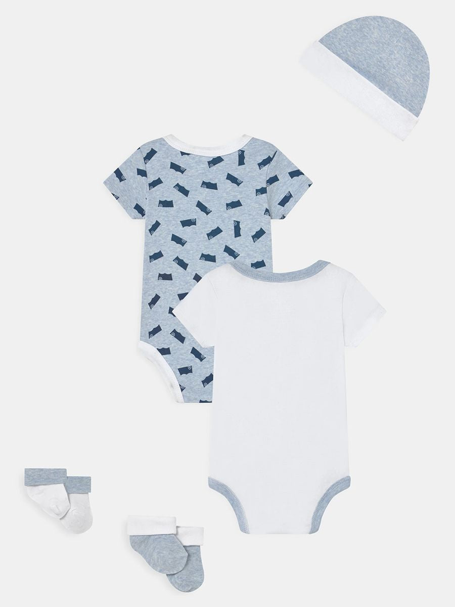 Set Regalo composto da due body manica corta tinta unita e fantasia Logo. Cappello con Ricamo e calze Babbucce racchiuse in un unica confezione regalo