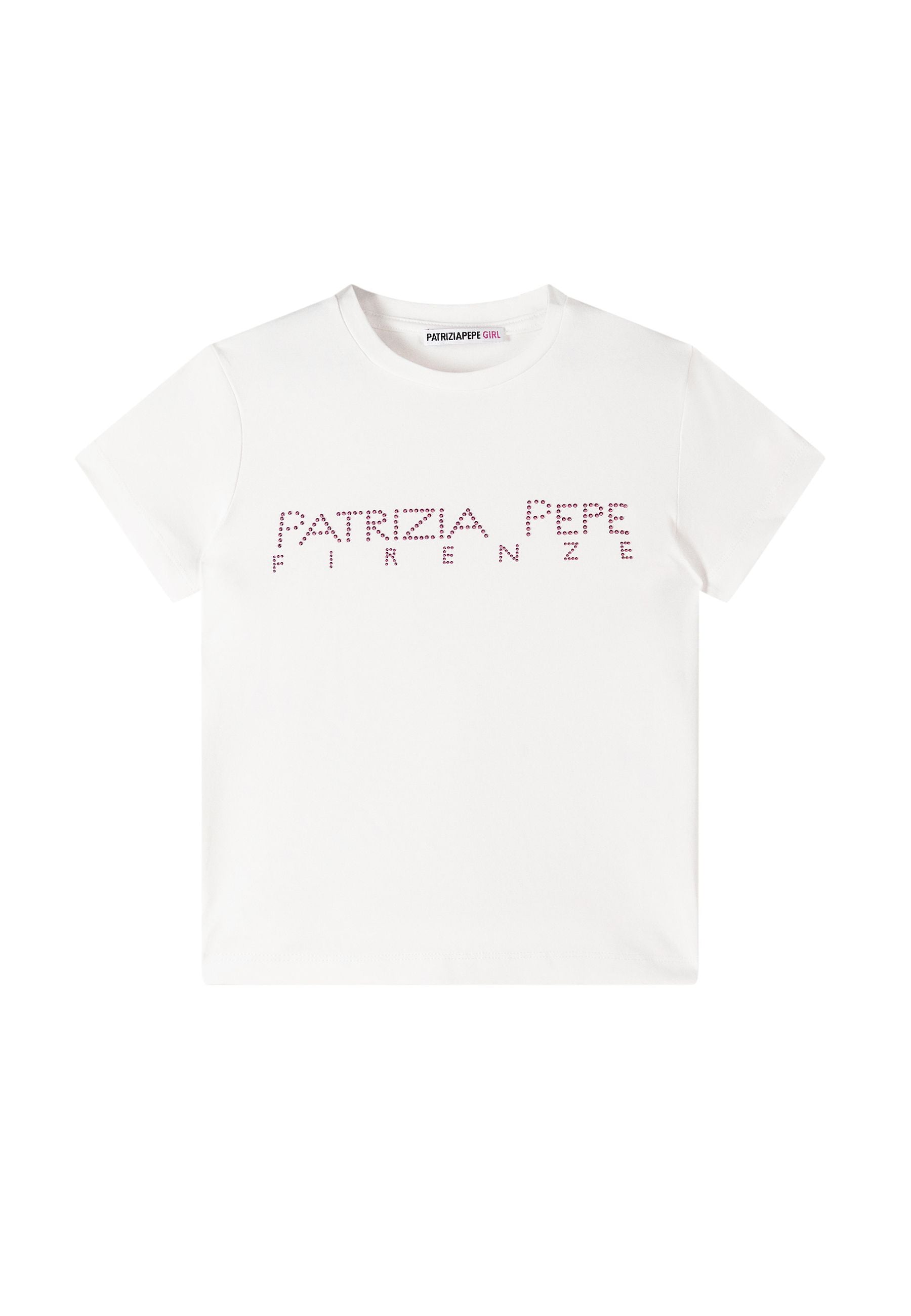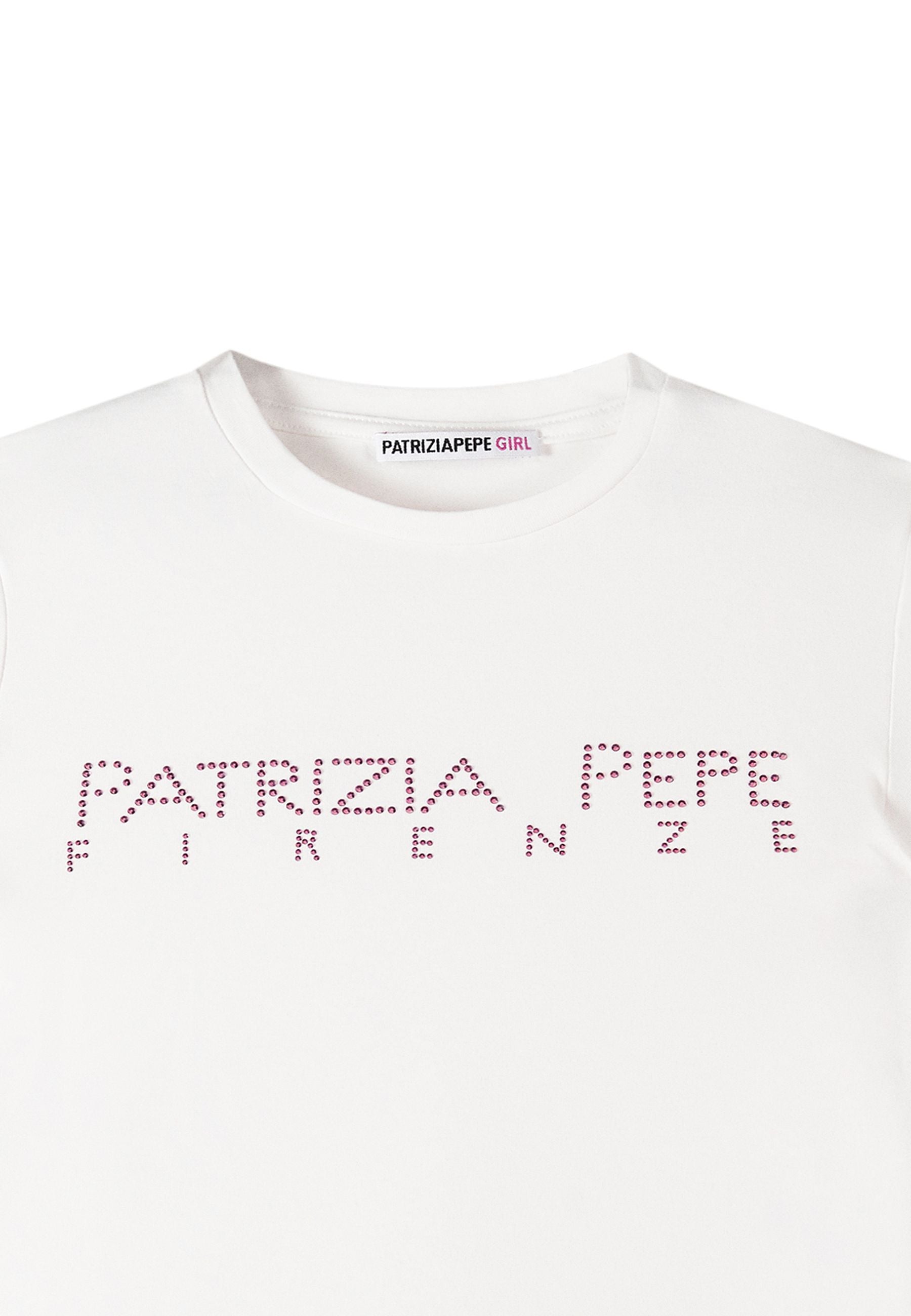 T-shirt Patrizia Pepe per bambine realizzata in maglia leggermente elastica morbida e confortevole con taglio dritto che garantisce totale libertà di movimento Tessuto elasticizzato a maglia fine e classico girocollo rotondo con logo Patrizia Pepe Firenze in Strass luminoso e raffinato Un capo esclusivo proposto da Bimbivip partner storico affidabile e riconosciuto nel panorama europeo dell’e-commerce e retail punto di riferimento per famiglie attente a qualità originalità e prestigio dei marchi offrendo ogni volta un’esperienza d’acquisto sicura soddisfacente e appagante Seguire attentamente le istruzioni di lavaggio riportate sull'etichetta all'interno del capo. made in ITALIA composizione 10%PA90%VI