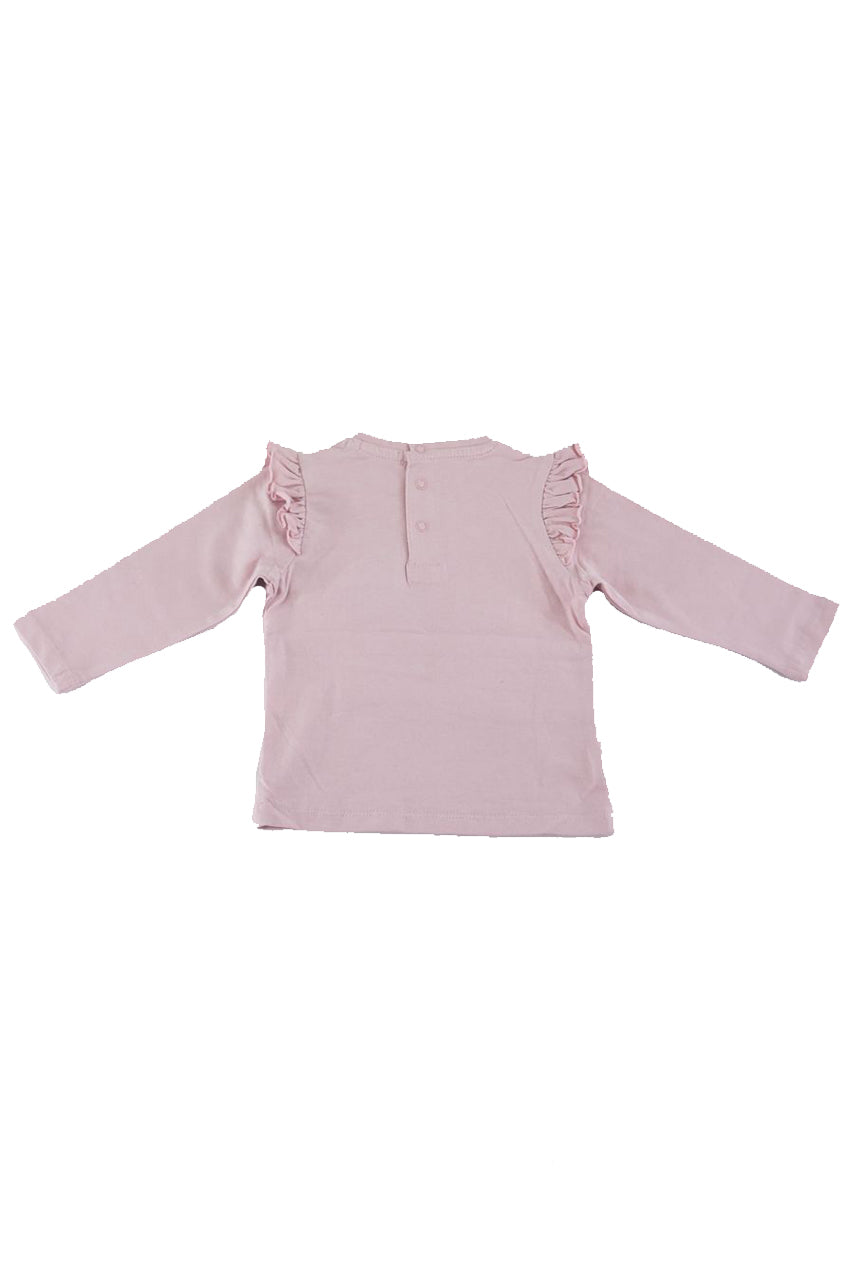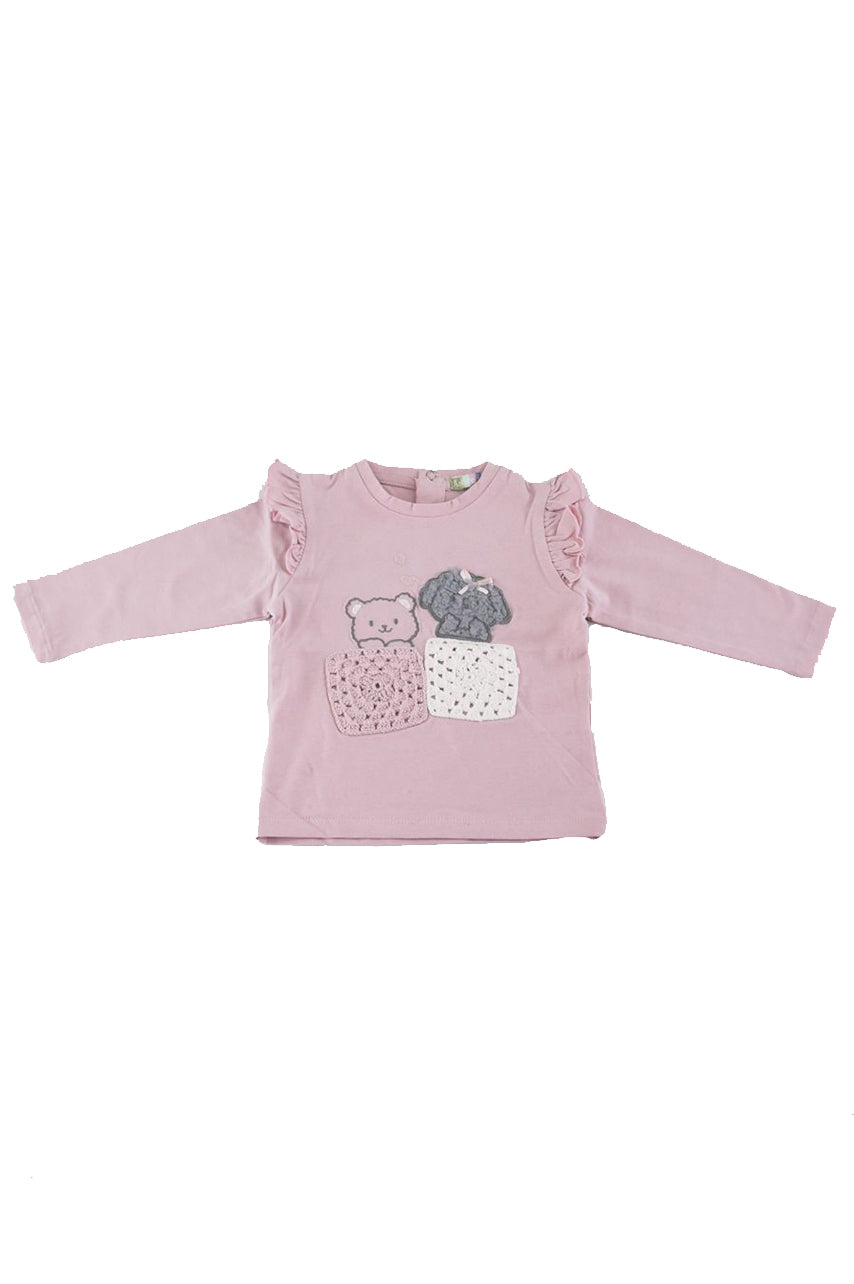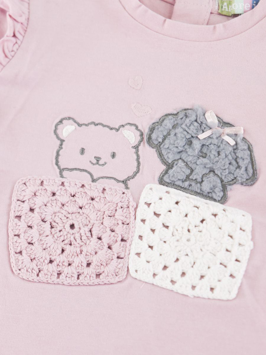 T-shirt girocollo con Bottoni posteriori a pressione. Stampa e applicazione di Patch a uncinetto
