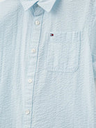 Camicia a maniche corte è realizzata in puro cotone con una finitura seersucker per un tocco di texture. Cotone puro seersucker proveniente dalla Better Cotton Initiative a filato tinto. Colletto aperto una tasca sul petto con ricamo della bandiera Tommy Hilfiger