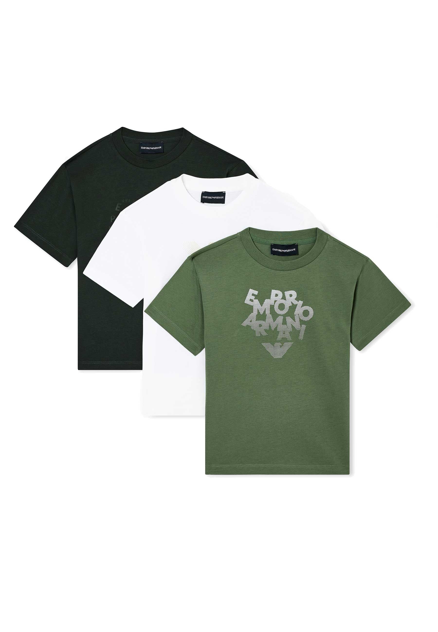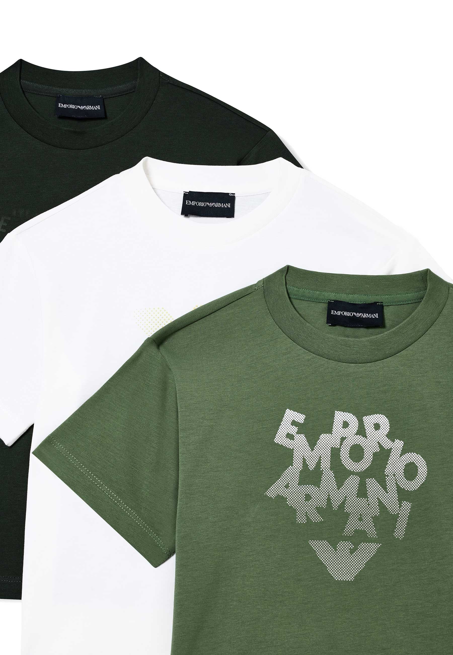 T-shirt Tris Girocollo per ragazzi firmato Emporio Armani in maglia leggera fresca e confortevole realizzata in puro cotone traspirante di qualità superiore dal tocco morbido e piacevole stampe eleganti e raffinate esprimono uno stile intramontabile mentre il taglio dritto garantisce libertà di movimento naturale maniche corte e girocollo classico con pratica chiusura a scatto facilitano ogni utilizzo capi progettati nel rispetto dell Armani Sustainability Project con materiali organici e riciclati e riduzione di acqua ed energia in linea con Better Cotton prodotto esclusivo distribuito da Bimbivip.com partner storico affidabile e autorevole nel panorama europeo ecommerce e retail punto di riferimento per famiglie attente a qualità autenticità e marchi prestigiosi Bimbivip assicura esperienza di acquisto sicura trasparente e gratificante con rigorosa selezione e garanzia di originalità per uno shopping sereno di alto valore