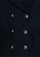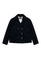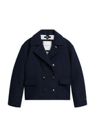 Cappotto corto in panno collo a V con doppi bottoni frontali. Tasche frontali sul fondo con palta. Manica con ricamo su polso
