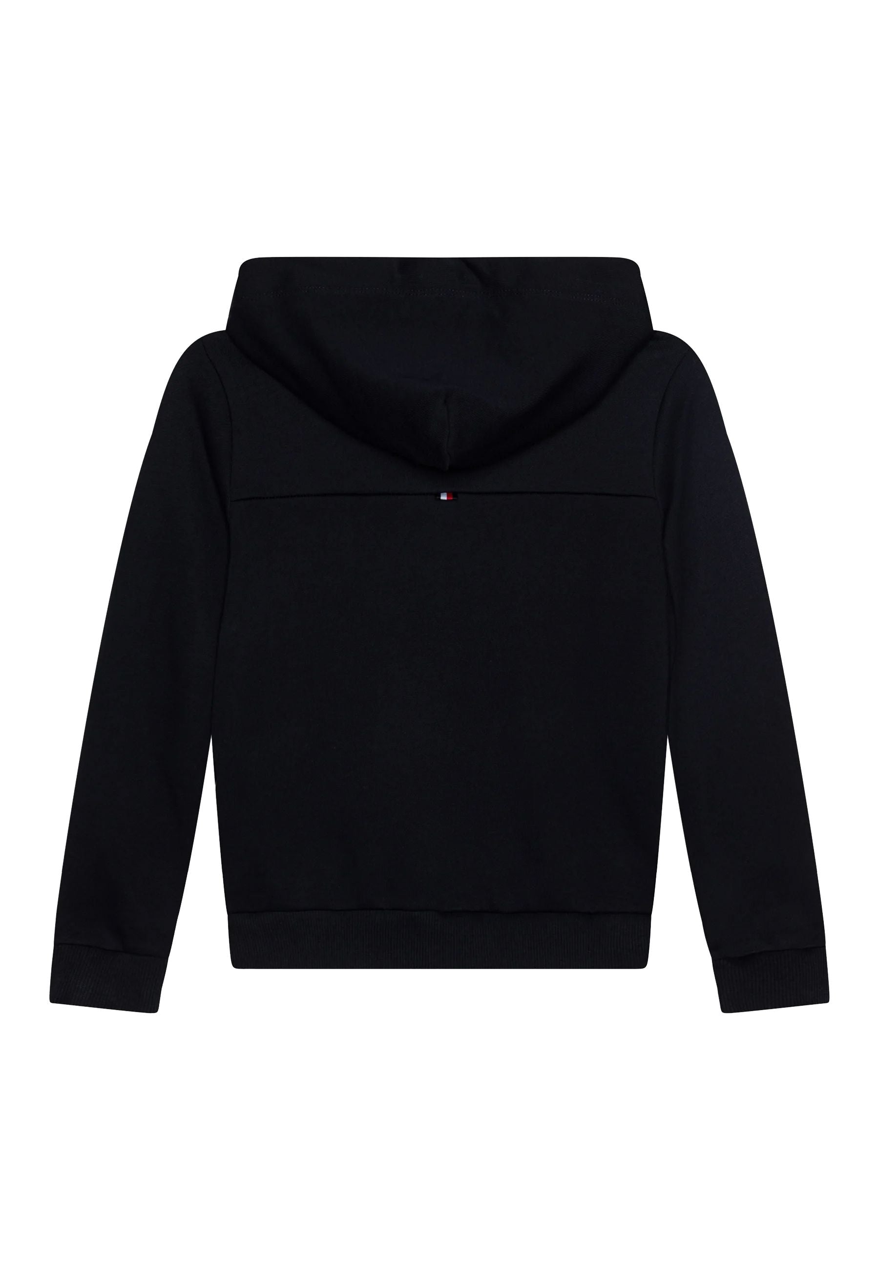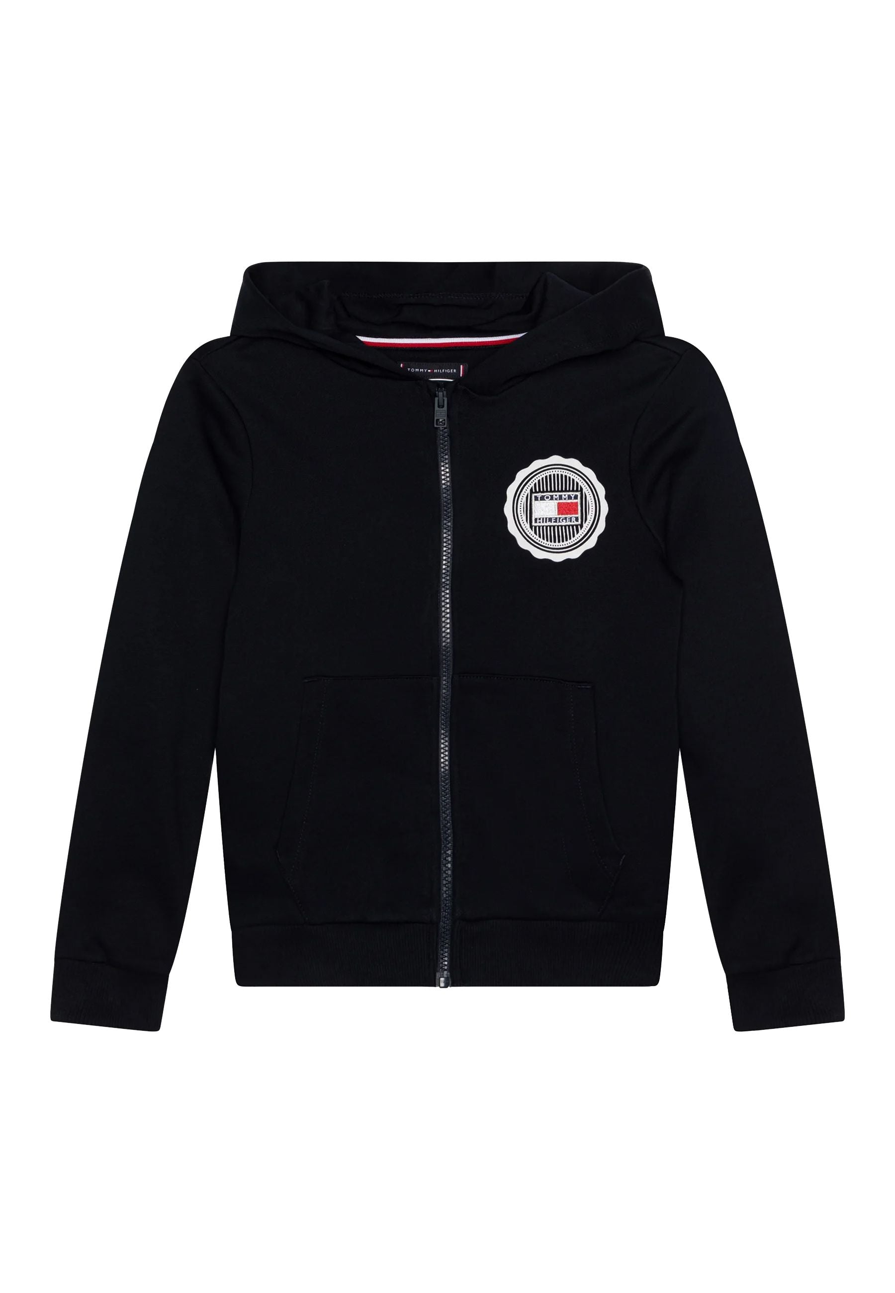 Felpa con cappuccio e zip è realizzata in cotone e presenta un logo stampato sul petto. Ha un cappuccio una chiusura a zip completa e una tasca a marsupio divisa. Il marchio Tommy Hilfiger è visibile. La vestibilità è regolare