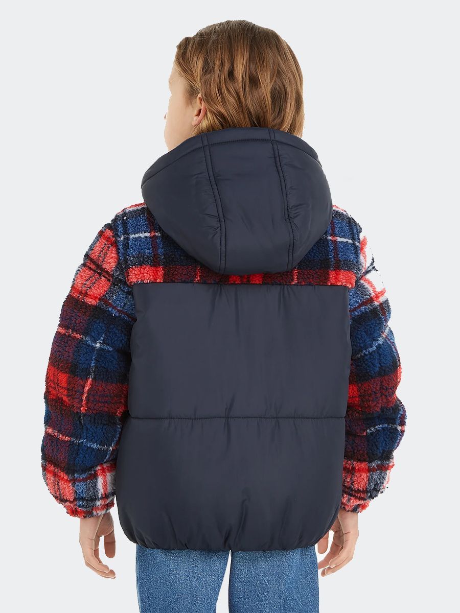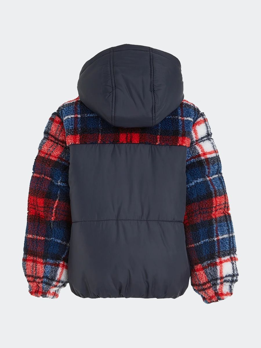 Giubbino Sherpa con cappuccio a fantasia a quadri scozzesi su spalle e sulle maniche. Zip intera con fondo e polsini elastici. Cappuccio non staccabile