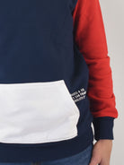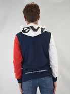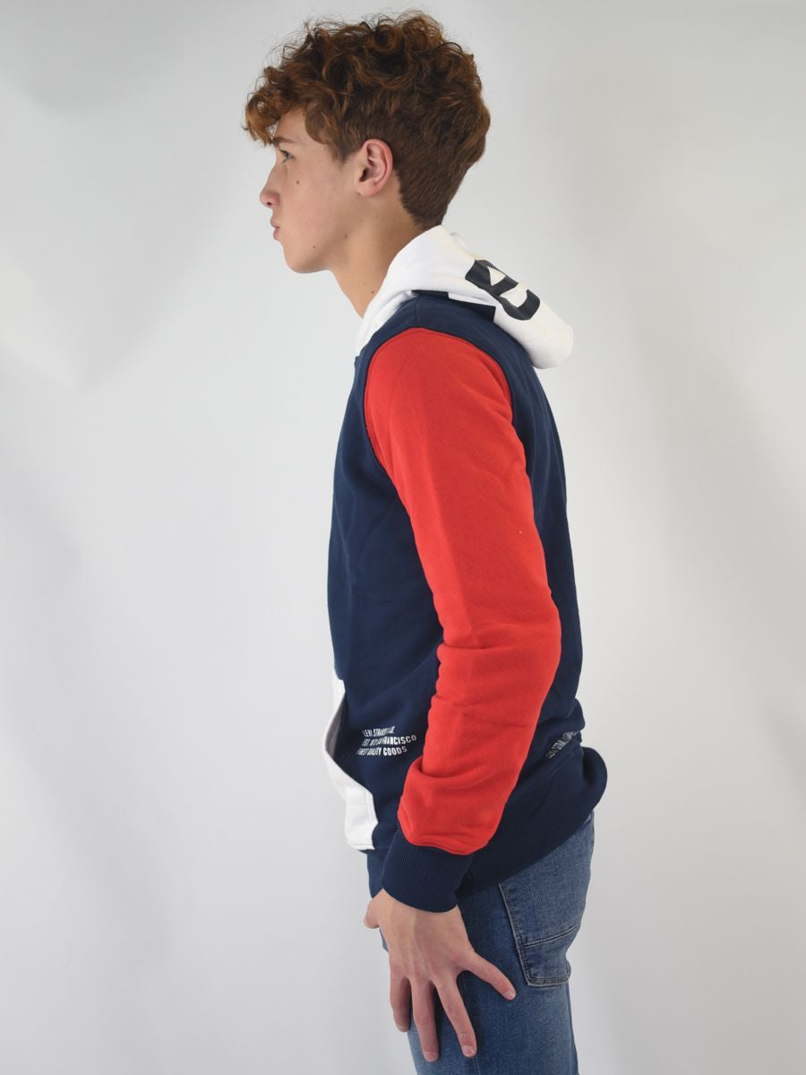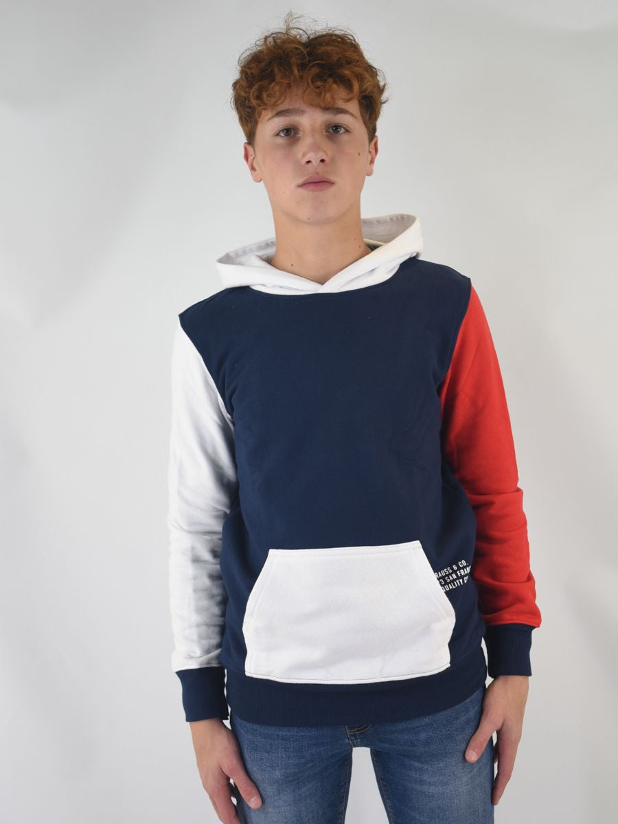 Felpa modello hoodie tricolore con cappuccio e tasca a marsupio frontale.