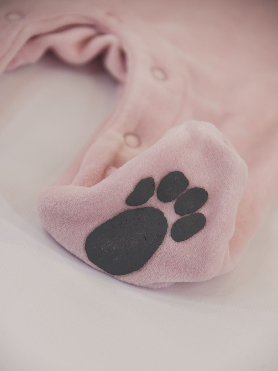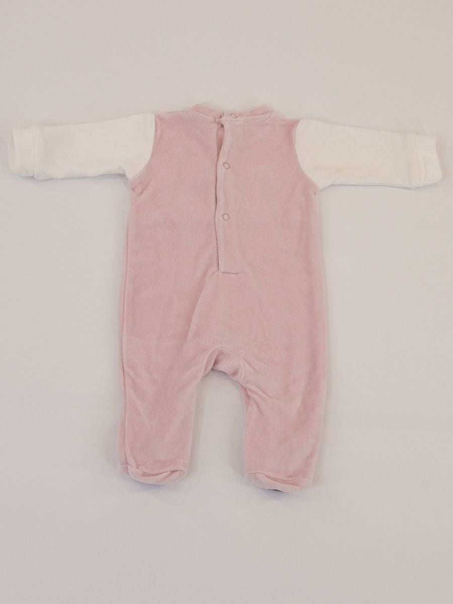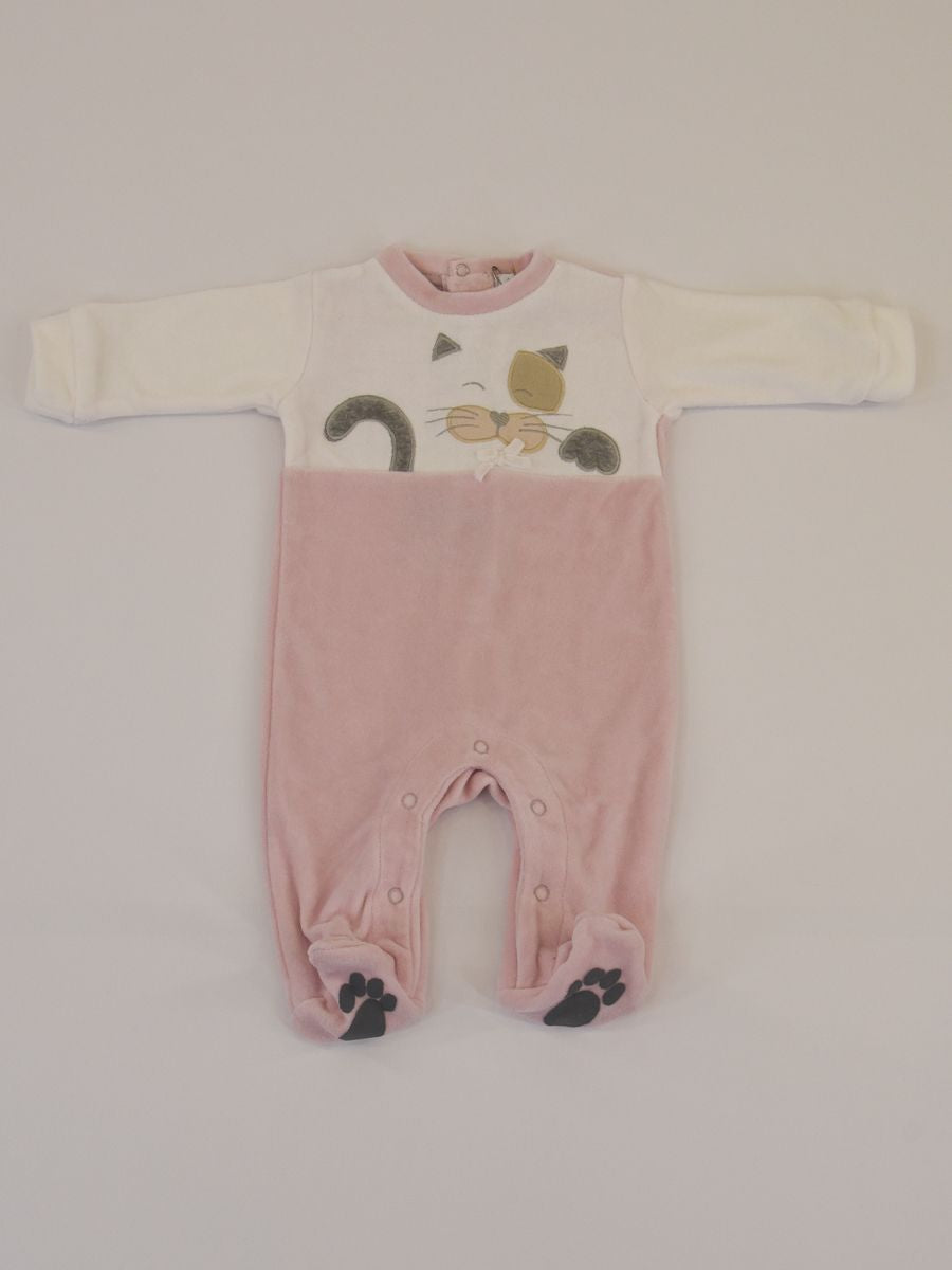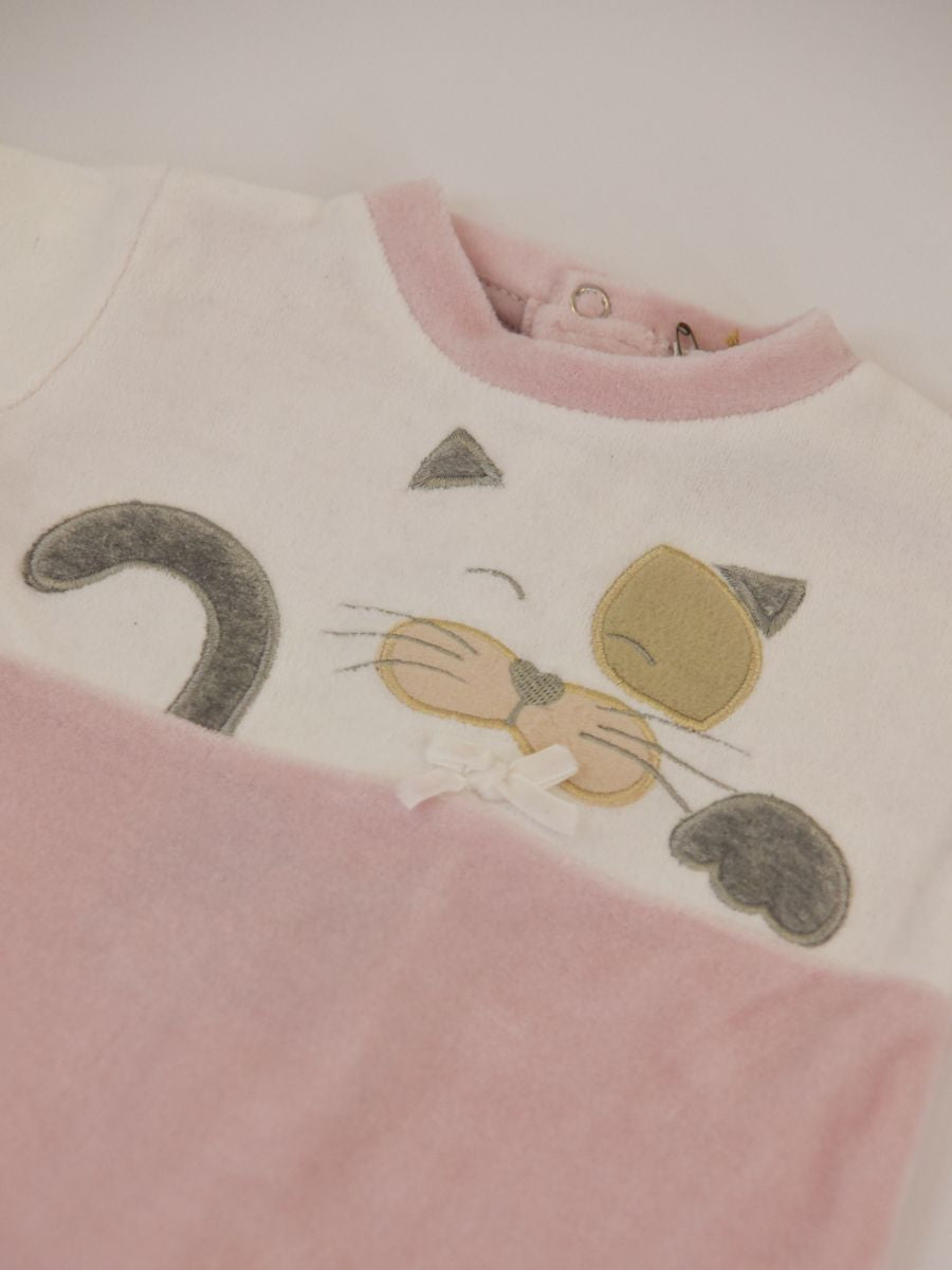 Tutina in morbida ciniglia bicolore a contrasto. Girocollo con Ricamo Gattino frontale. Chiusura Posteriore e sul fondo