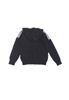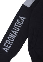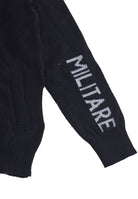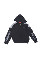 Zweifarbiger Pullover mit durchgehendem Reißverschluss und Kapuze. Schriftzug „Areonatica Militare“ in Kontrastfarbe auf den Armen. Seitentaschen und gerippte Herzseitenstickerei am Kapuzenrand unten und an den Ärmelbündchen