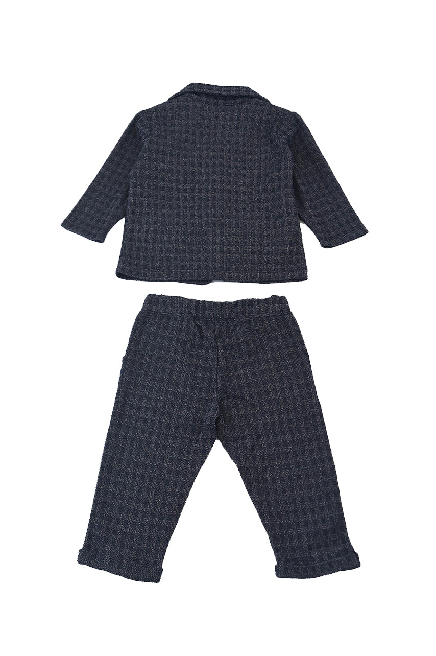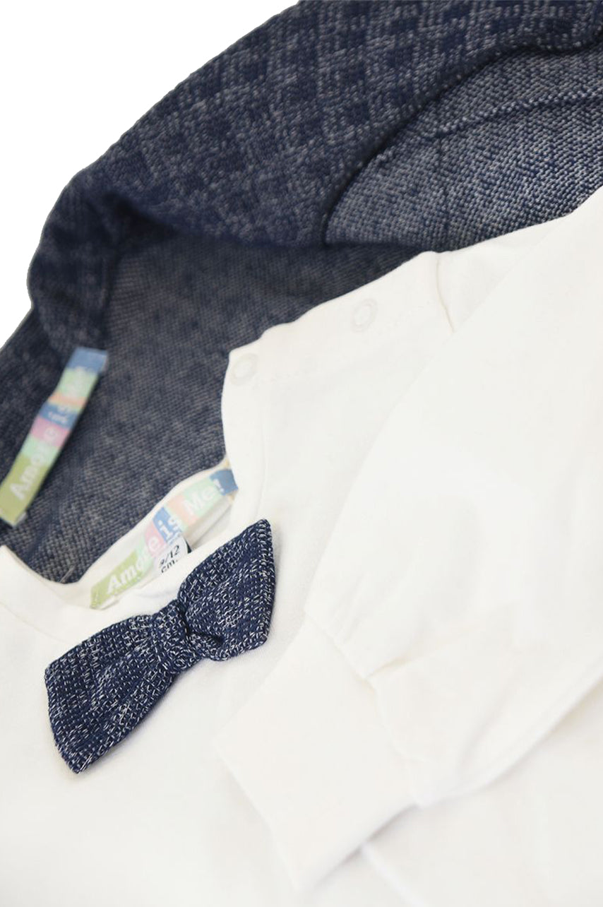 Elegantes Outfit bestehend aus einem einfarbigen Fleece-Cardigan mit Knöpfen vorne und Nähten an den Manschetten und am Saum. Langarm-T-Shirt mit Druckknöpfen auf der Rückseite. Elisabethanische Farbverzierung am Rand. Shorts mit Schottenmuster und elastischem Bund
