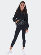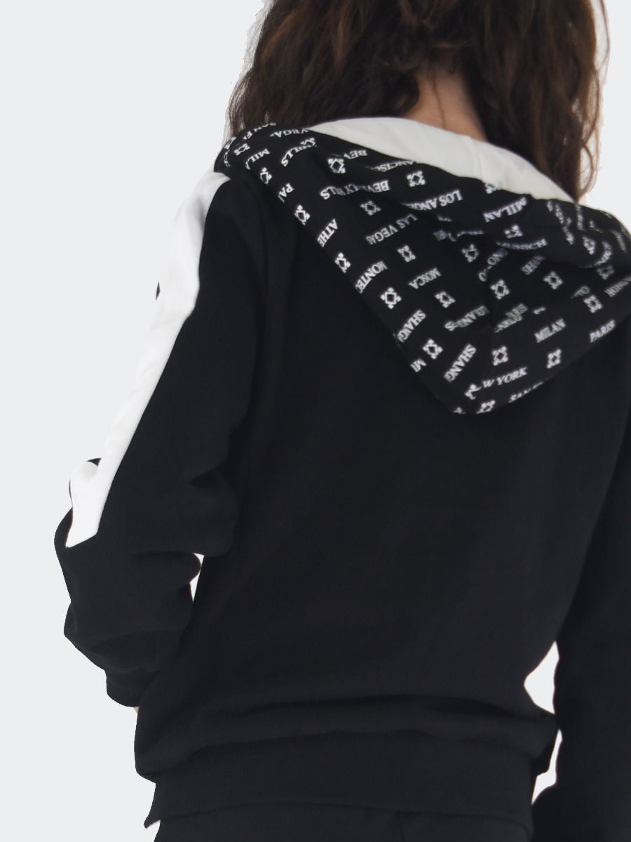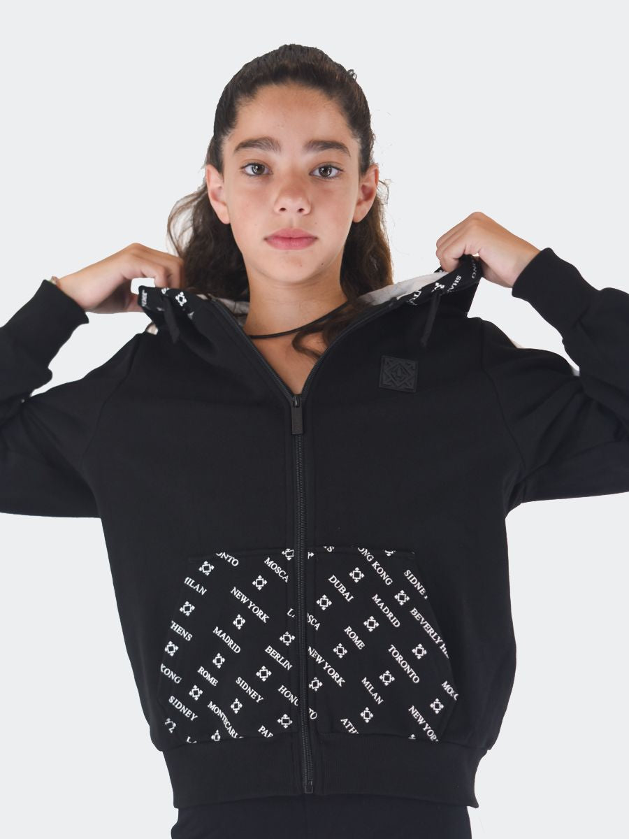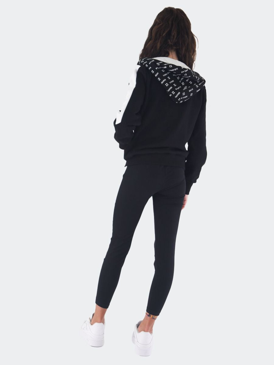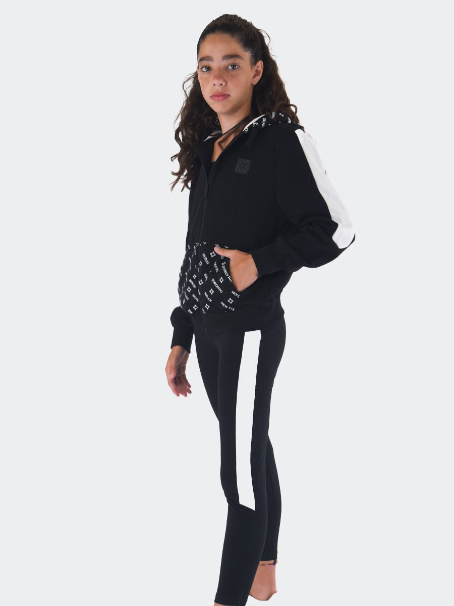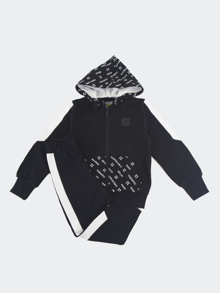 Trainingsanzug bestehend aus einem Sweatshirt mit durchgehendem Reißverschluss, Vordertaschen und verstellbarer Kapuze mit Allover-City-Logo-Aufdruck. Sweatshirt mit geripptem Saum und Bündchen sowie kontrastfarbenem Seitenband wie bei der Stretch-Jogging-Leggings mit QrCode-Logo hinten