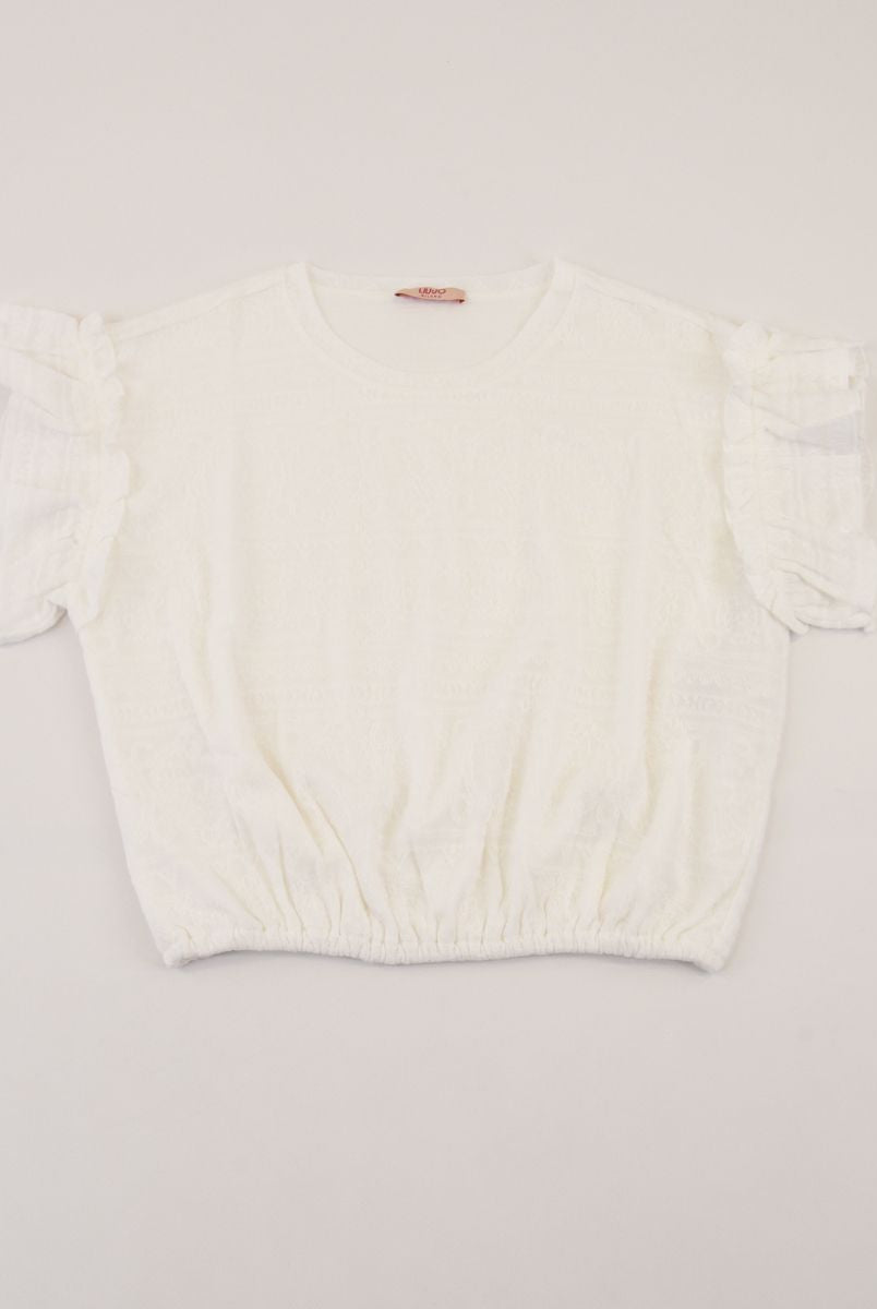 Einfarbiges Oberteil aus Punto Milano-Stoff mit eingesetzten Ärmeln und Saum mit sichtbarem Logo