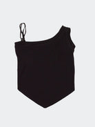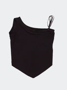 Oberteil aus weicher, einfarbiger Viskose mit einer ärmellosen Seite und einer Seite mit verstellbaren Trägern. V-förmiger Boden