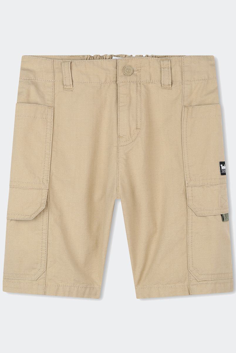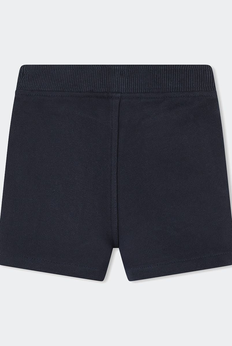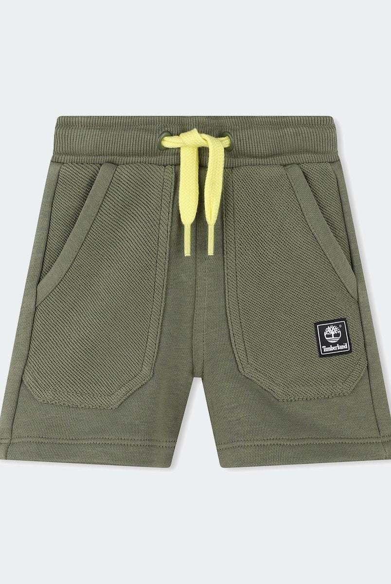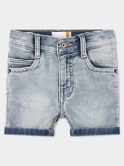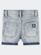 Stretch-Jeansshorts mit verstellbarem elastischem Bund und gewebtem Etikett auf der Rückseite.