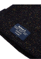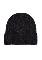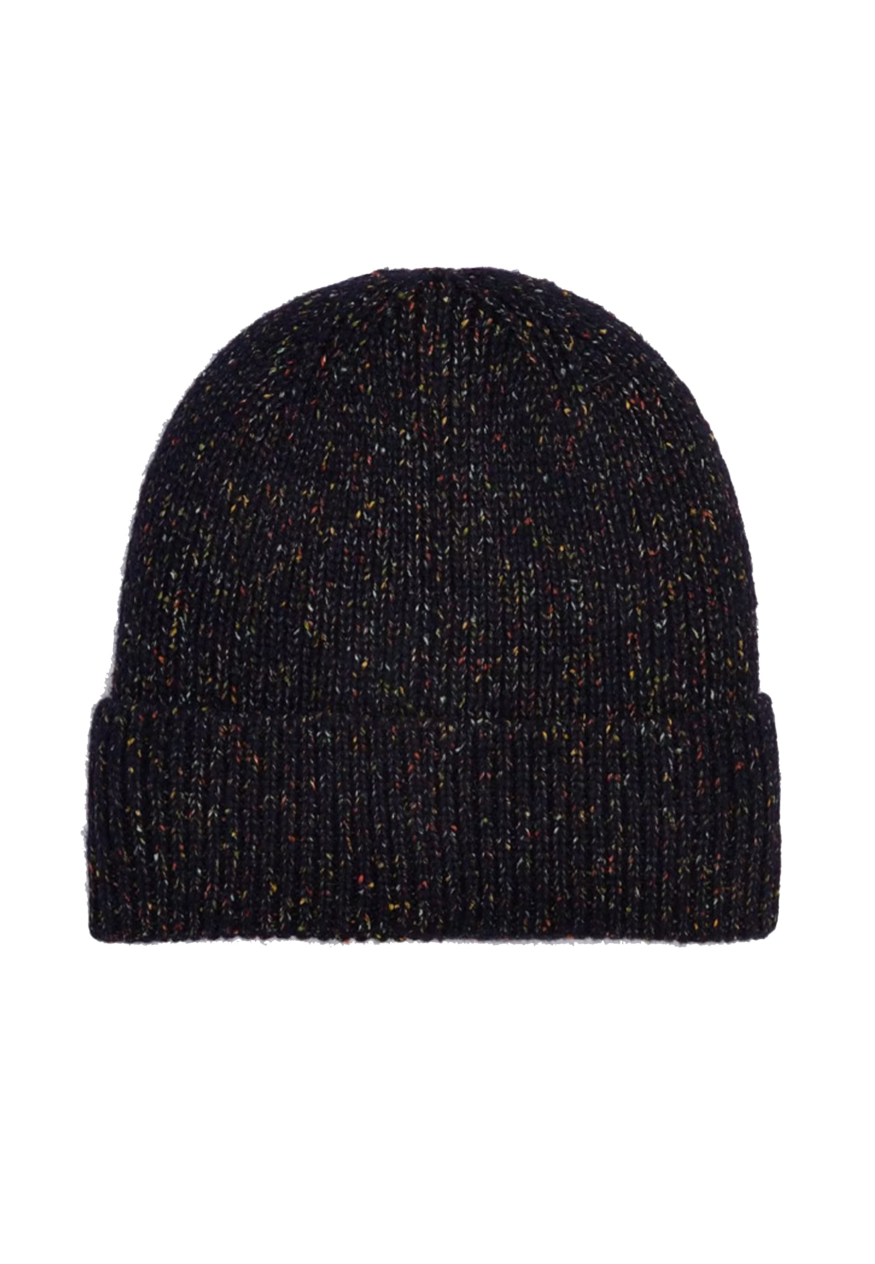 Warme und umhüllende Mütze mit Umschlag und Stoffetikett auf der Vorderseite. Braunes Muster mit mehrfarbigem Salz und Pfeffer