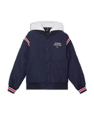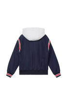 Monotype 1985-Jacke aus Nylon und elastischem Stoff aus dem Bomber-Archiv. Durchgehender Reißverschluss mit offenen Seitentaschen. Kapuze aus Melange-Fleece