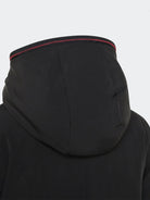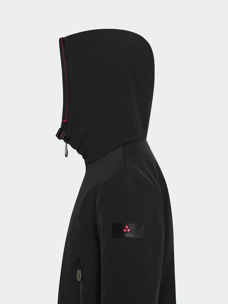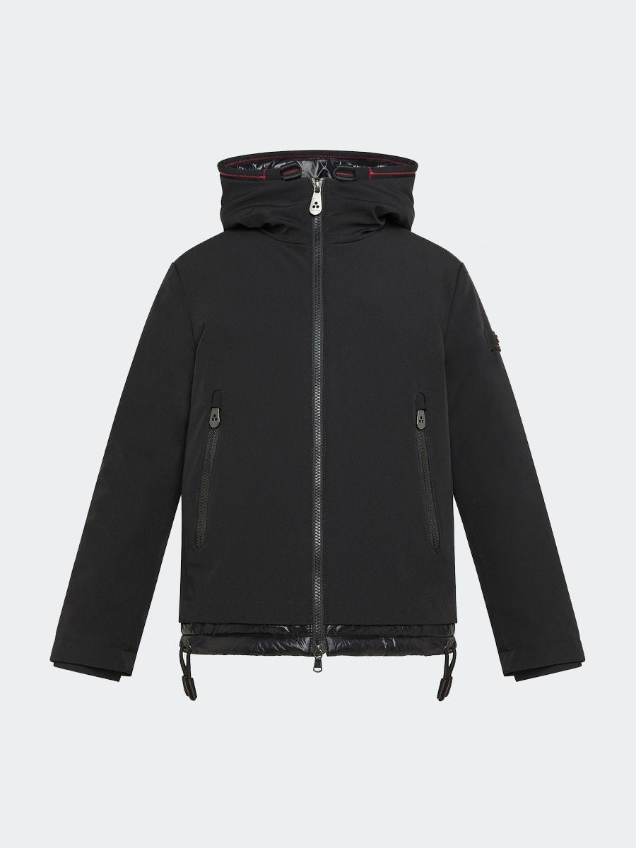 Bomber-Daunenjacke aus Stretch-Nylongewebe, innen mit weichem und warmem Nylon-Jersey mit synthetischer Wattierung gefüttert. Es verfügt über einen zentralen Doppelreißverschluss, einen hohen Kragen mit schwarzen Details, Seitentaschen und winddichte Bündchen. Diese Jacke ist ideal für die Zwischensaison und speziell für junge Leute konzipiert. Der zentrale Verschluss hat einen Doppelschieber, die Länge ist kurz und der hohe Kragen hat Riemen. Die Manschetten sind so konzipiert, dass sie dem Wind standhalten. Der Stoff besteht aus Stretch-Nylon gepaart mit einem weichen Jersey
