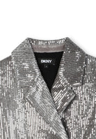 Giacca mini-me DKNY argentata elegante luminosa e raffinata con paillettes ricamate su velluto di poliestere morbido e resistente Fodera interna in viscosa confortevole e piacevole sulla pelle Due tasche anteriori pratiche e funzionali Chiusura con bottoni sicura e curata Placca metallica DKNY frontale distintiva e sofisticata Un prodotto esclusivo distribuito da Bimbivip partner storico affidabile e riconosciuto nel panorama europeo dell’e-commerce e retail punto di riferimento per le famiglie alla ricerca di qualità originalità e garanzia di marchi prestigiosi per un’esperienza d’acquisto sicura soddisfacente e appagante
