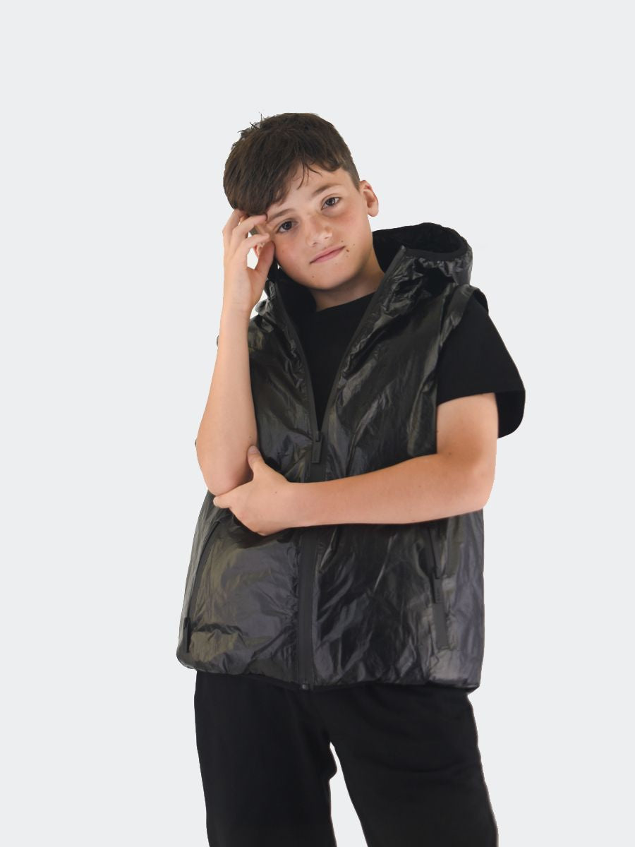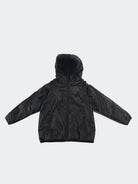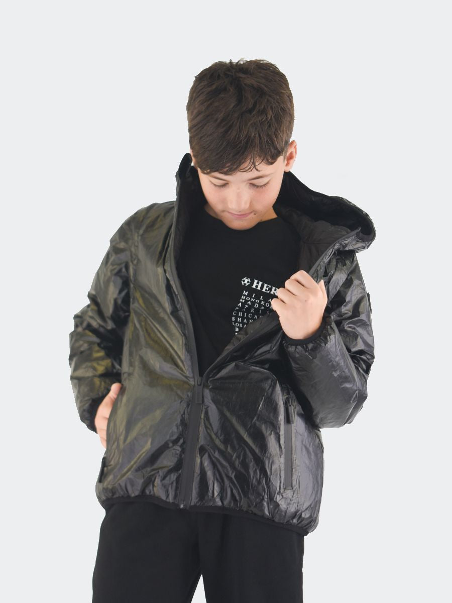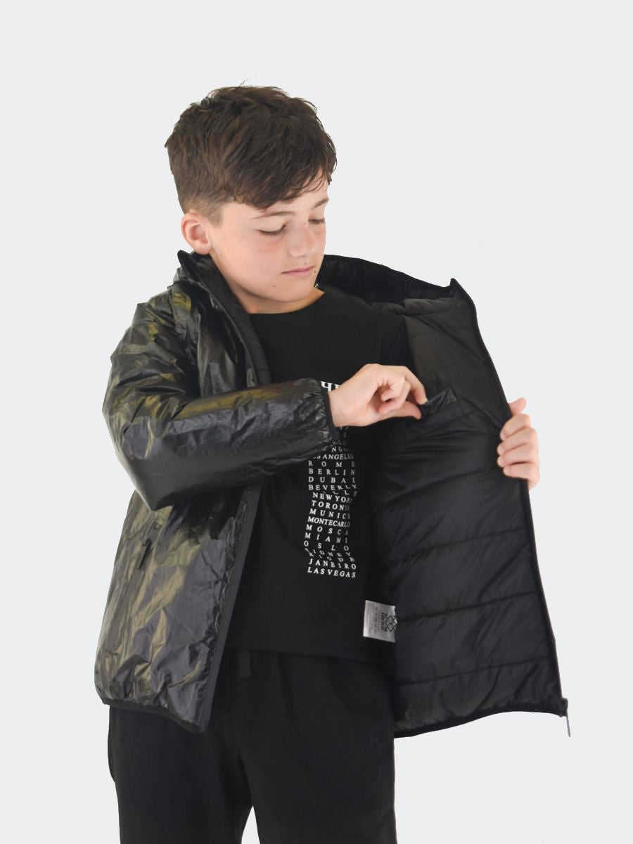 Einfarbige, wattierte Tyvek-Jacke mit Kapuzenkragen. Einreihiges 2-in-1-Modell mit langen Ärmeln und abnehmbarem Reißverschluss. Innenraum in Ecopiuma. viele Taschen mit Reißverschluss. Praktisches und elastisches Modell mit gepolsterter Innensteppdecke. Saum an Bündchen und Kapuze mit elastischem Rippbündchen und Logo-Patch am linken Ärmel