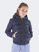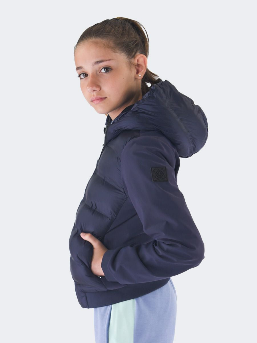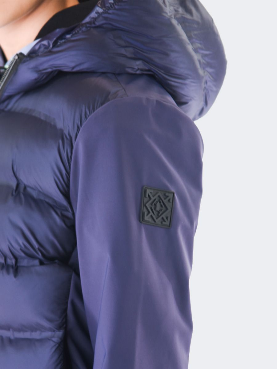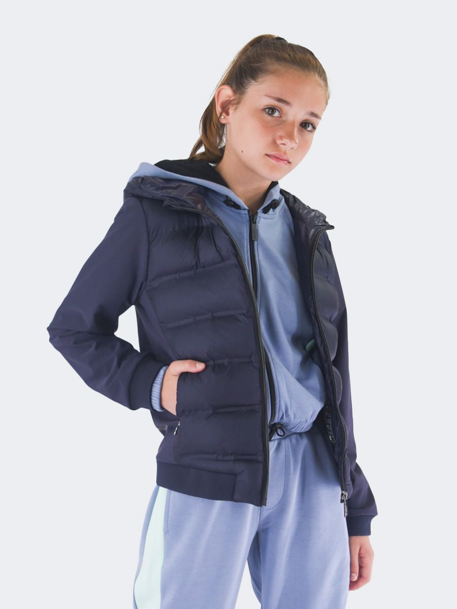 Einfarbige Jacke mit Kapuzenkragen. Einreihig mit langen Ärmeln. Innenausstattung aus Federn. viele Taschen mit Reißverschluss. Praktisches und elastisches Modell. Elastischer Rippstrick an Saum und Bündchen sowie Logo-Aufnäher am linken Ärmel