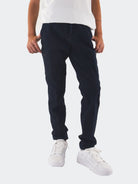 Normal geschnittene Hose mit elastischem Bund, verstellbar durch Kordelzug und künstlicher Frontklappe. Seitliche Leistentaschen und versteckte Cargotaschen mit Druckknopfverschluss und Silikon-Logoaufnäher an der Seitentasche. Marken-Must-Haves