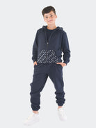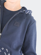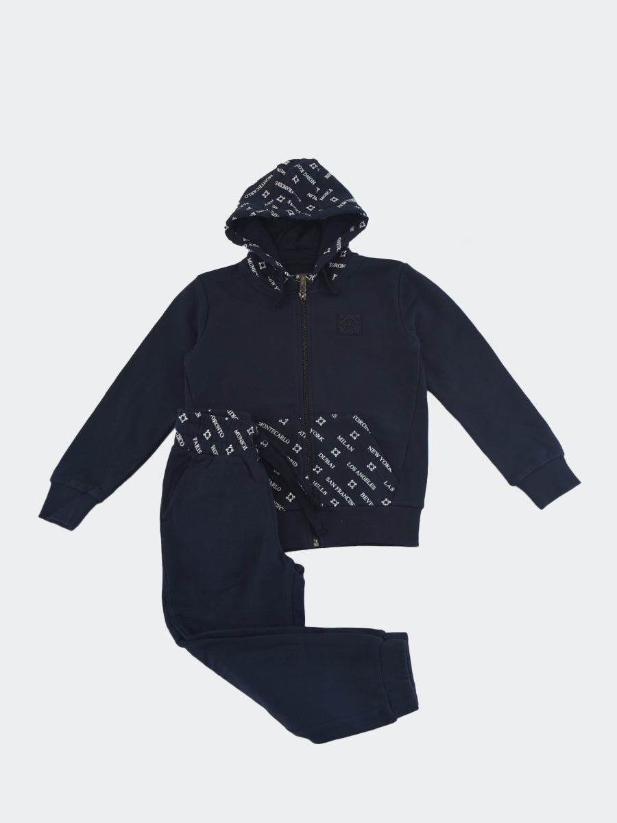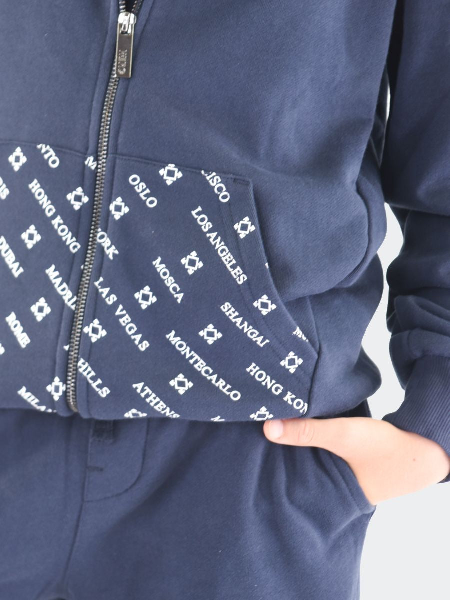 Trainingsanzug bestehend aus einem Sweatshirt mit durchgehendem Reißverschluss, Kängurutasche vorne und Kapuze mit durchgehendem Stadtlogo-Aufdruck. Sweatshirt mit geripptem Saum und Bündchen. Jogginghose mit bedrucktem, durch Kordelzug verstellbarem Bund, diagonalen Taschen und elastischem Saum. Gesäßtaschen mit Silikon-Logo-Patch