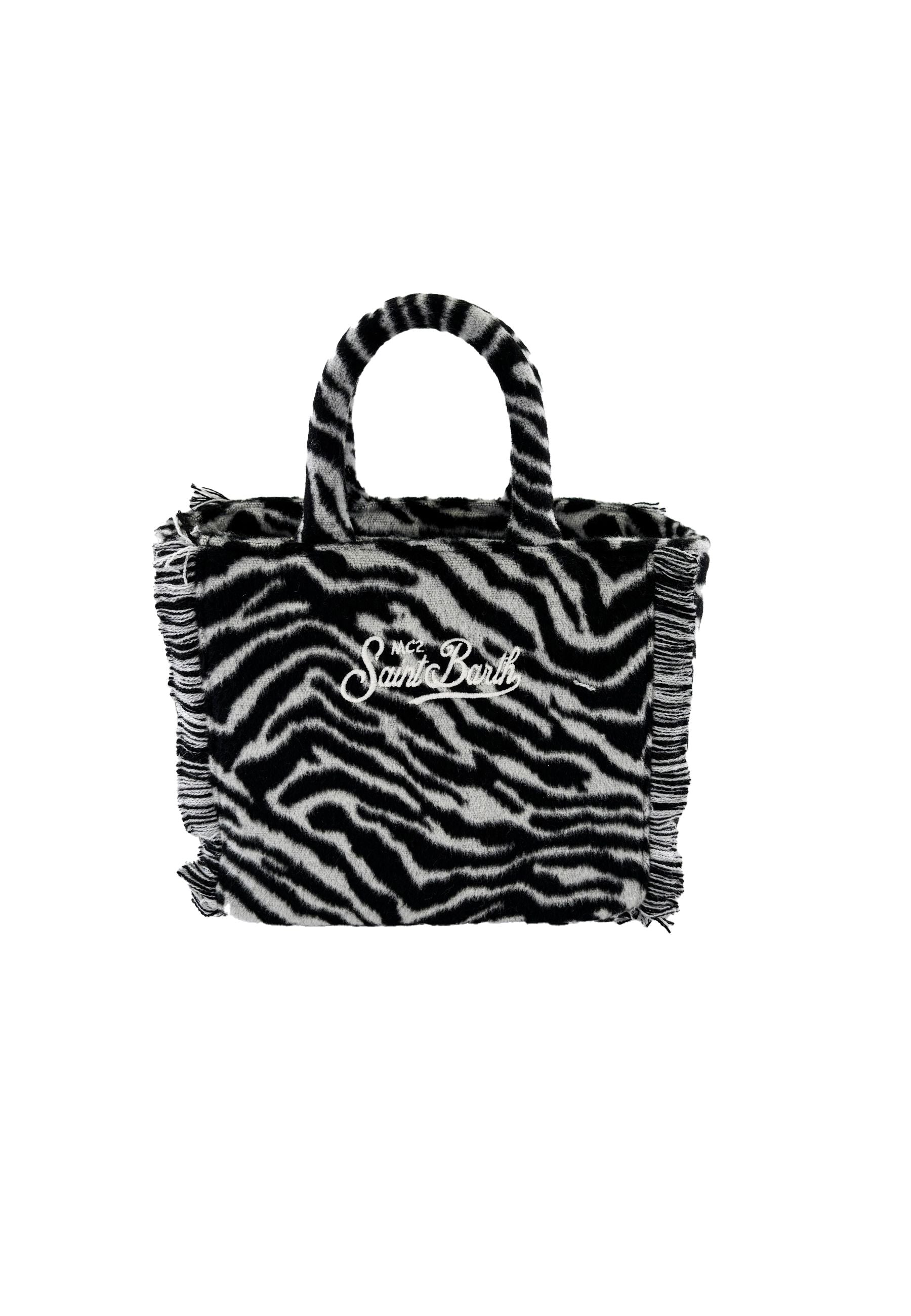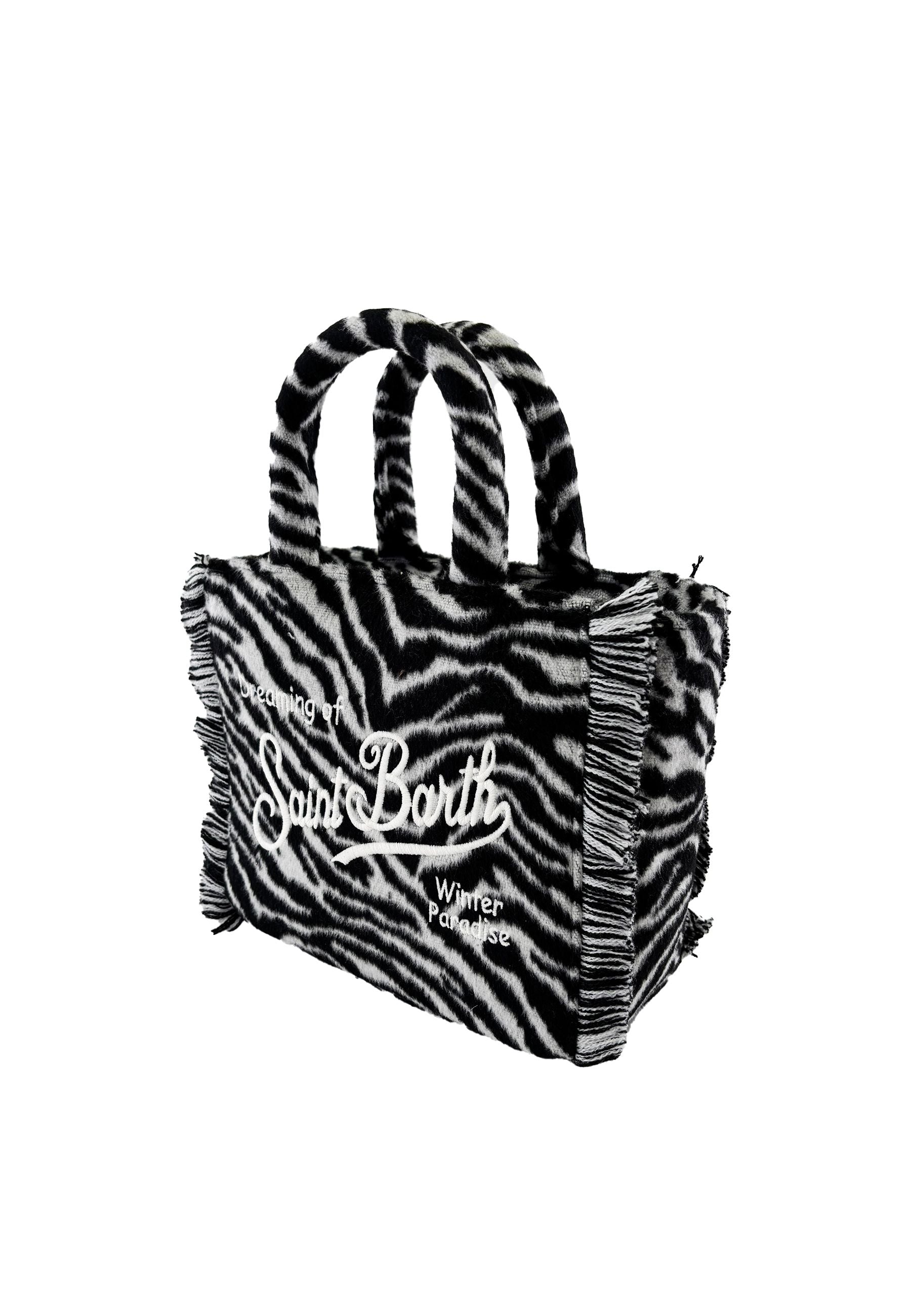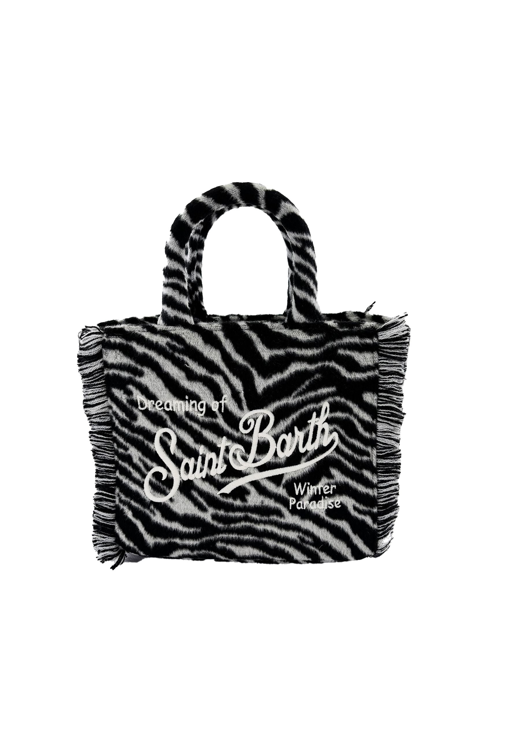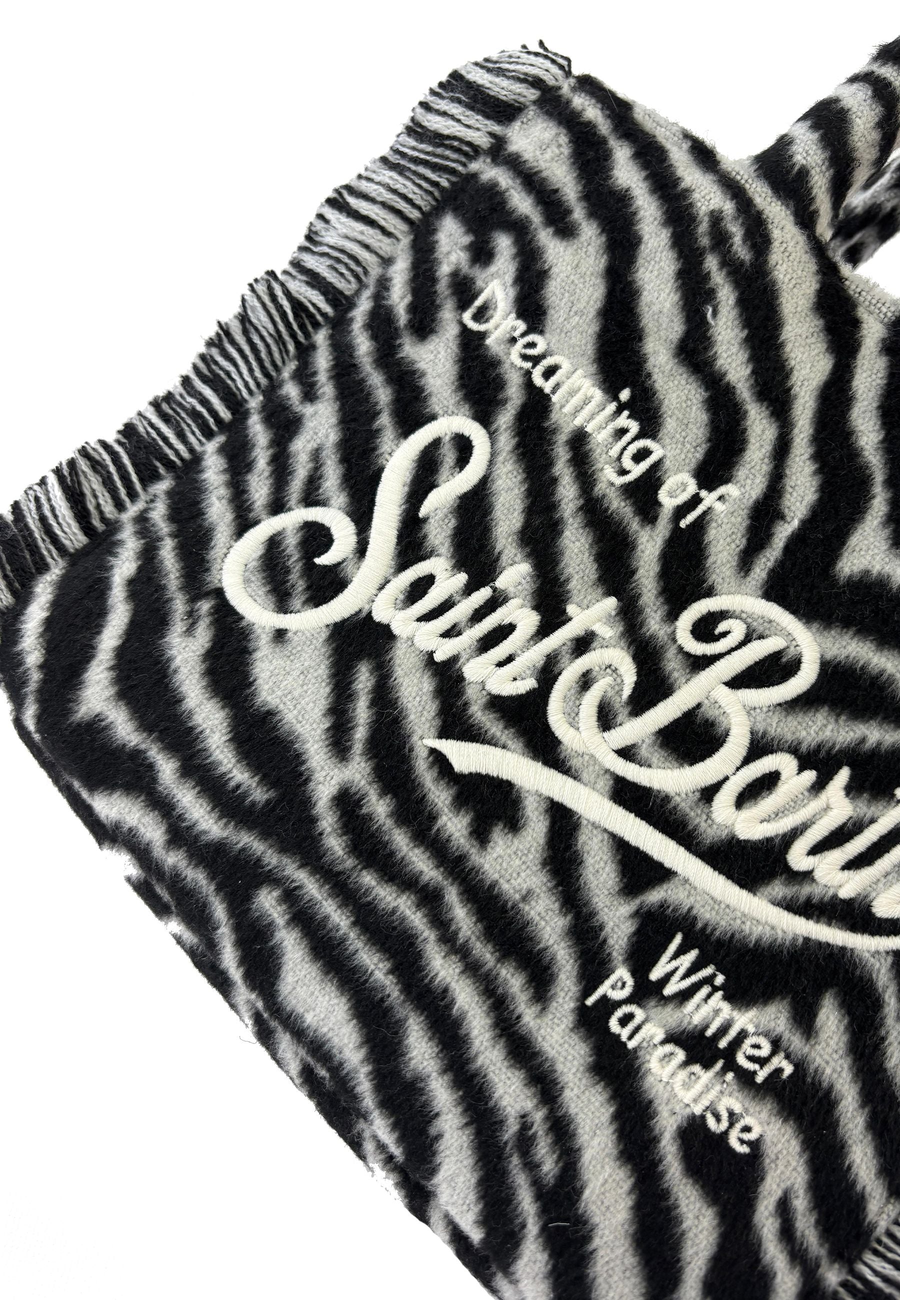 Borsa in tessuto teddy soffice e raffinato dal design zebrato audace ed elegante con ricamo Saint Barth distintivo e iconico dotata di tracolla removibile versatile e manici in ecopelle resistenti e curati nelle finiture dimensioni pratiche 30 x 20 x 12 cm perfetta per ogni occasione un prodotto esclusivo distribuito da Bimbivip partner storico e affidabile nel panorama europeo punto di riferimento per famiglie che ricercano qualità originalità e garanzia di marchi prestigiosi per vivere un’esperienza d’acquisto sicura gratificante e appagante