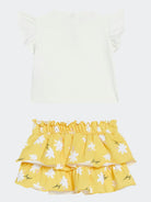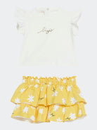 Elegantes Set bestehend aus kurzärmligem T-Shirt mit Rundhalsausschnitt, Bündchen und Logo mit Strasssteinen auf der Brust. Gemusterter Rock mit Blumendruck und hervorgehobenem Logo sowie elastischem Bund