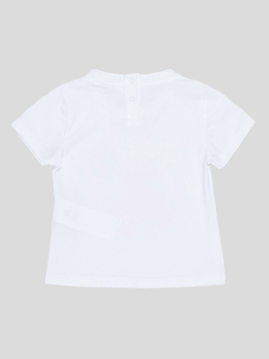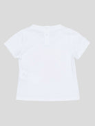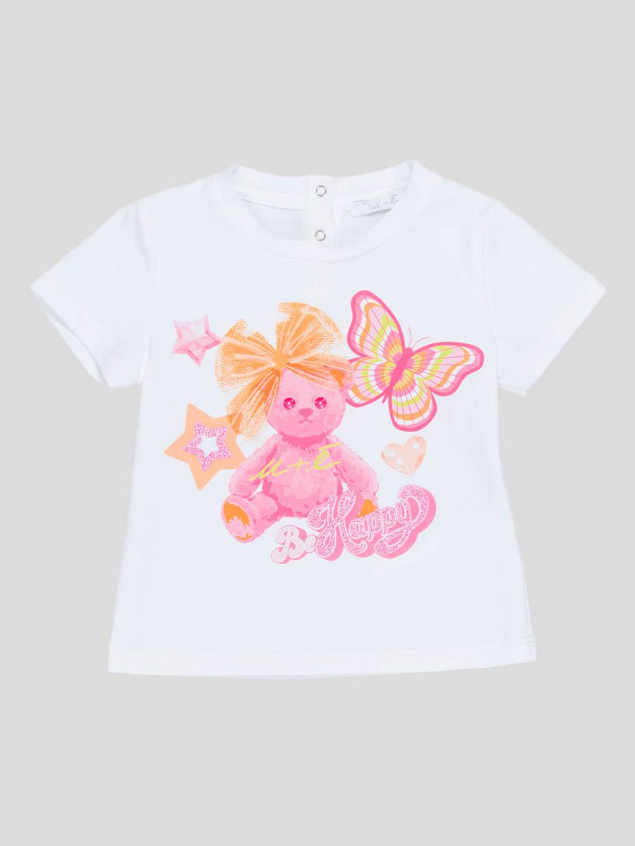 Einfarbiges, kurzärmliges T-Shirt mit Rundhalsausschnitt und „Be Happy“-Aufdruck auf der Vorderseite. Druckknopf auf der Rückseite des Kragens