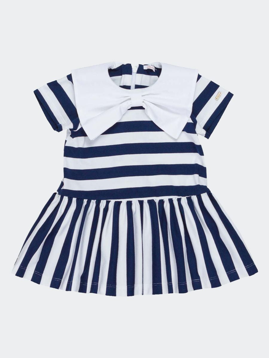 Abito a fantasia rigata a manica corta in cotone. Placchetta Logo sulla manica. Collo a fiocco tinta unita. Zip posteriore