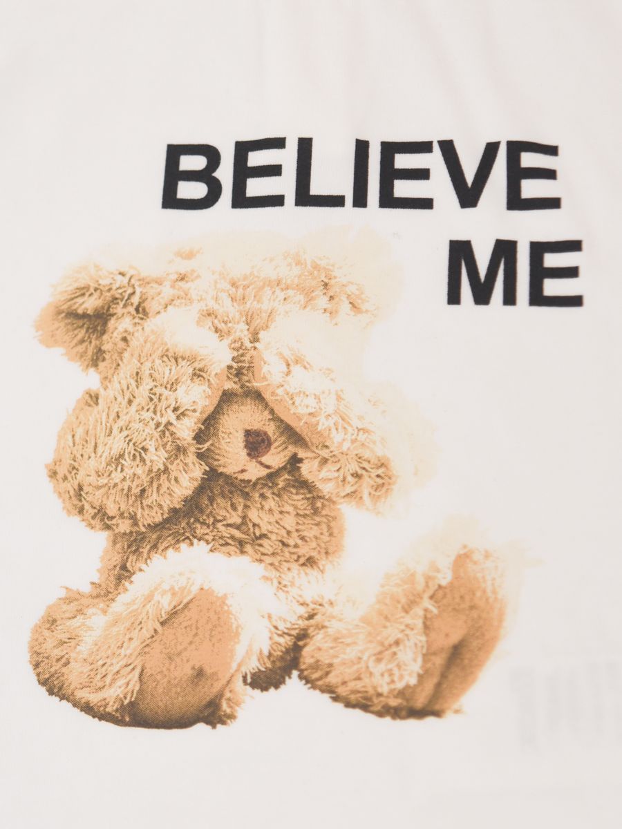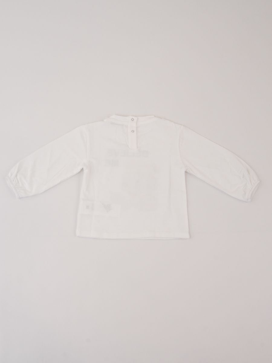 T-shirt girocollo a manica lunga tinta unita. Stampa frontale Believe Me. Polsi con elastico.Bottoni a pressione fino alla taglia 2 posteriore per facilitare la vestibilita