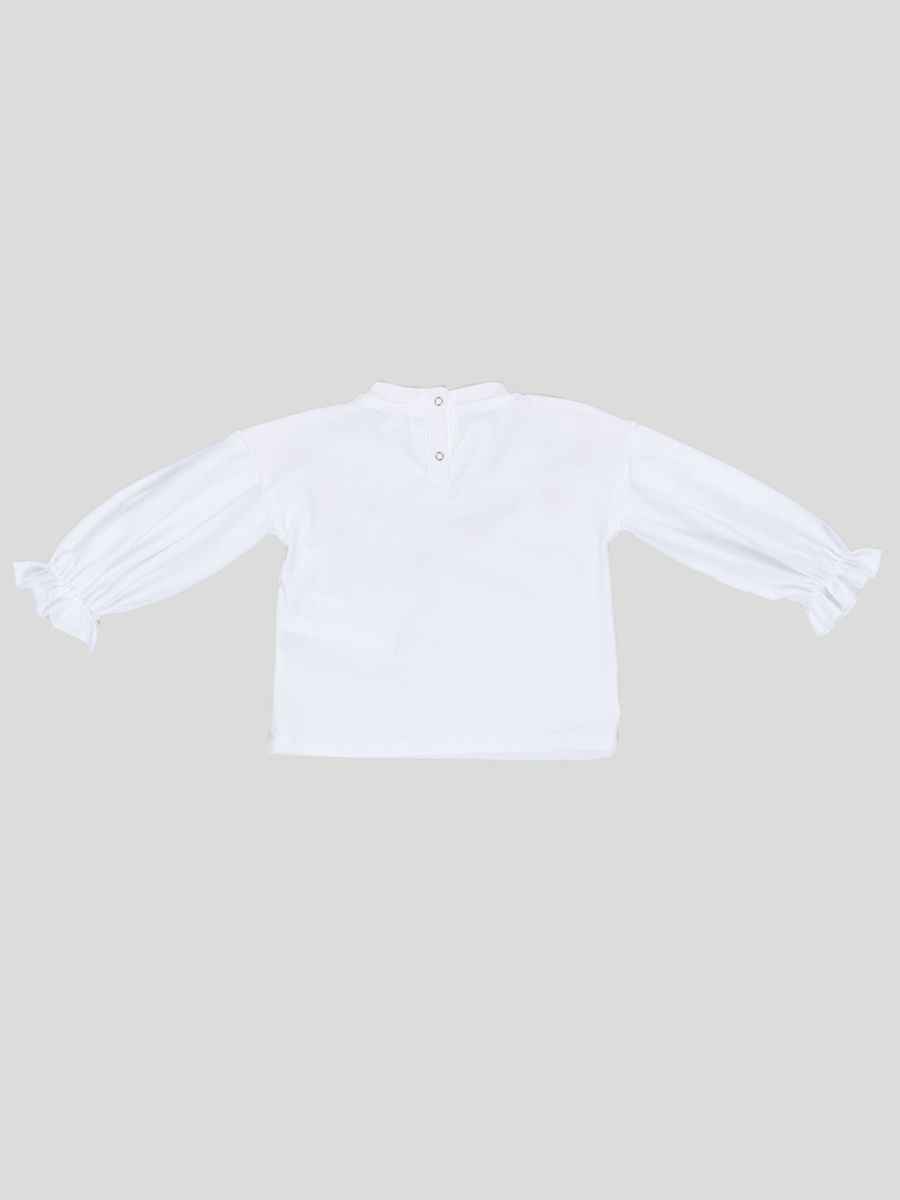 T-shirt girocollo a manica lunga tinta unita. Ricamo sotto collo. Bottoni a pressione posteriore. Polsi con elastici a rouge