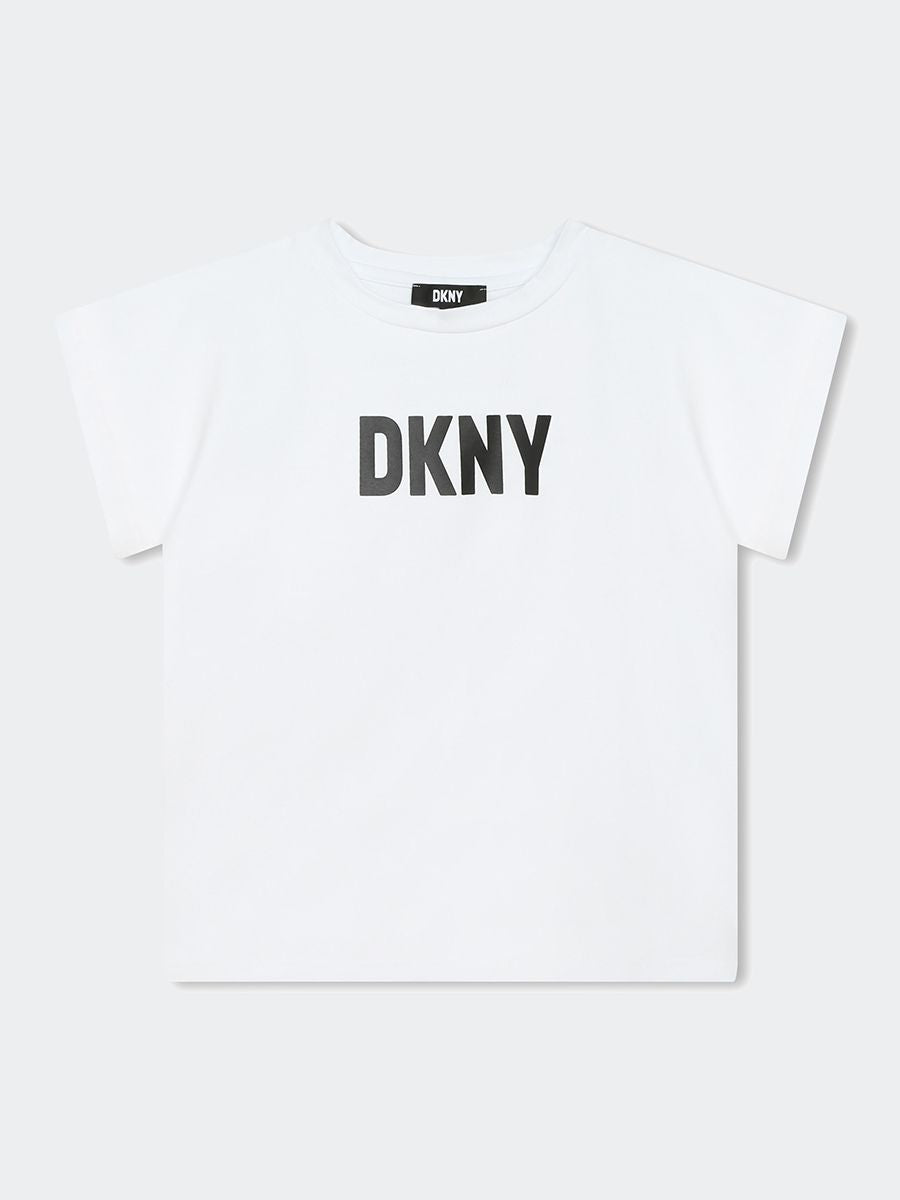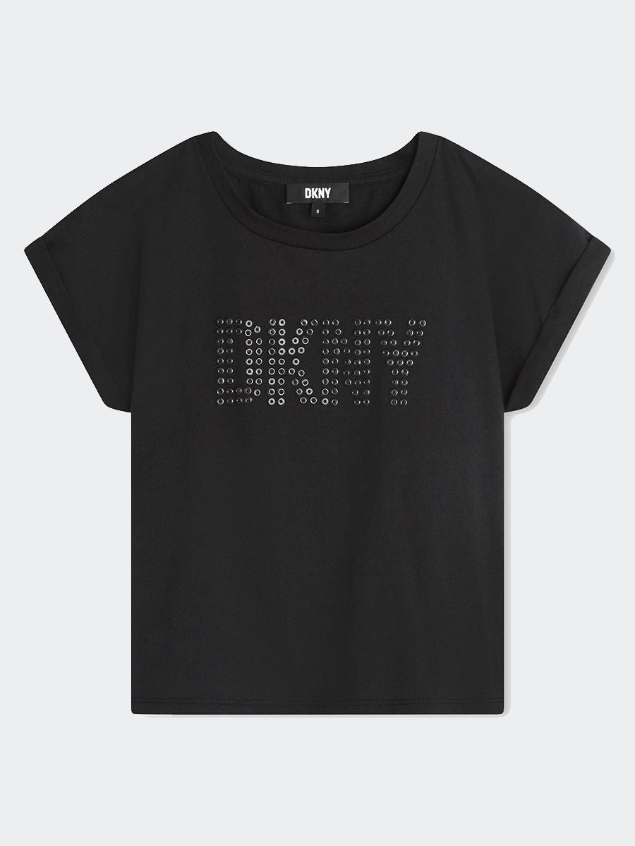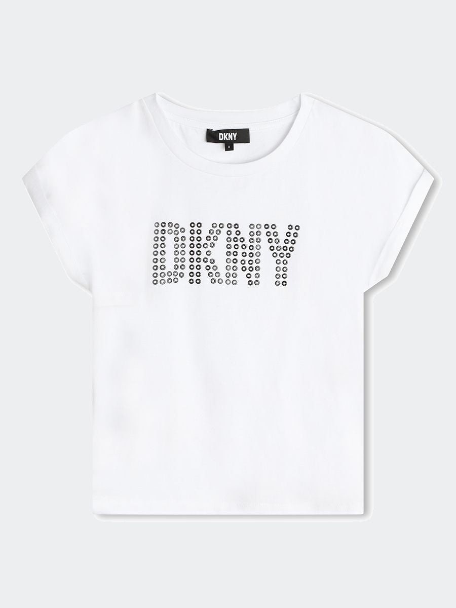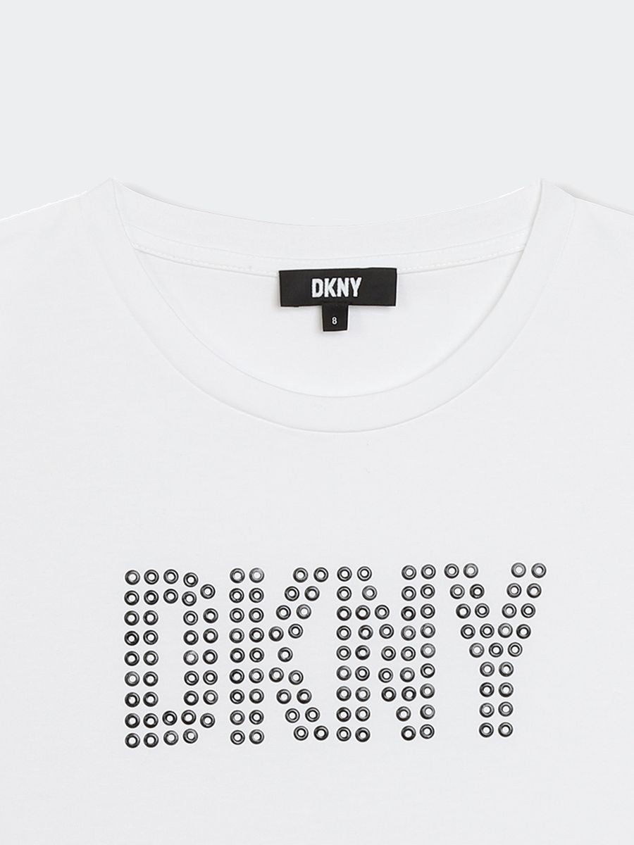 T-shirt T-shirt a maniche corte in jersey 94% cotone da agricoltura biologica e 6% elastan. Illustrazione DKNY sul davanti con borchie quadrate.