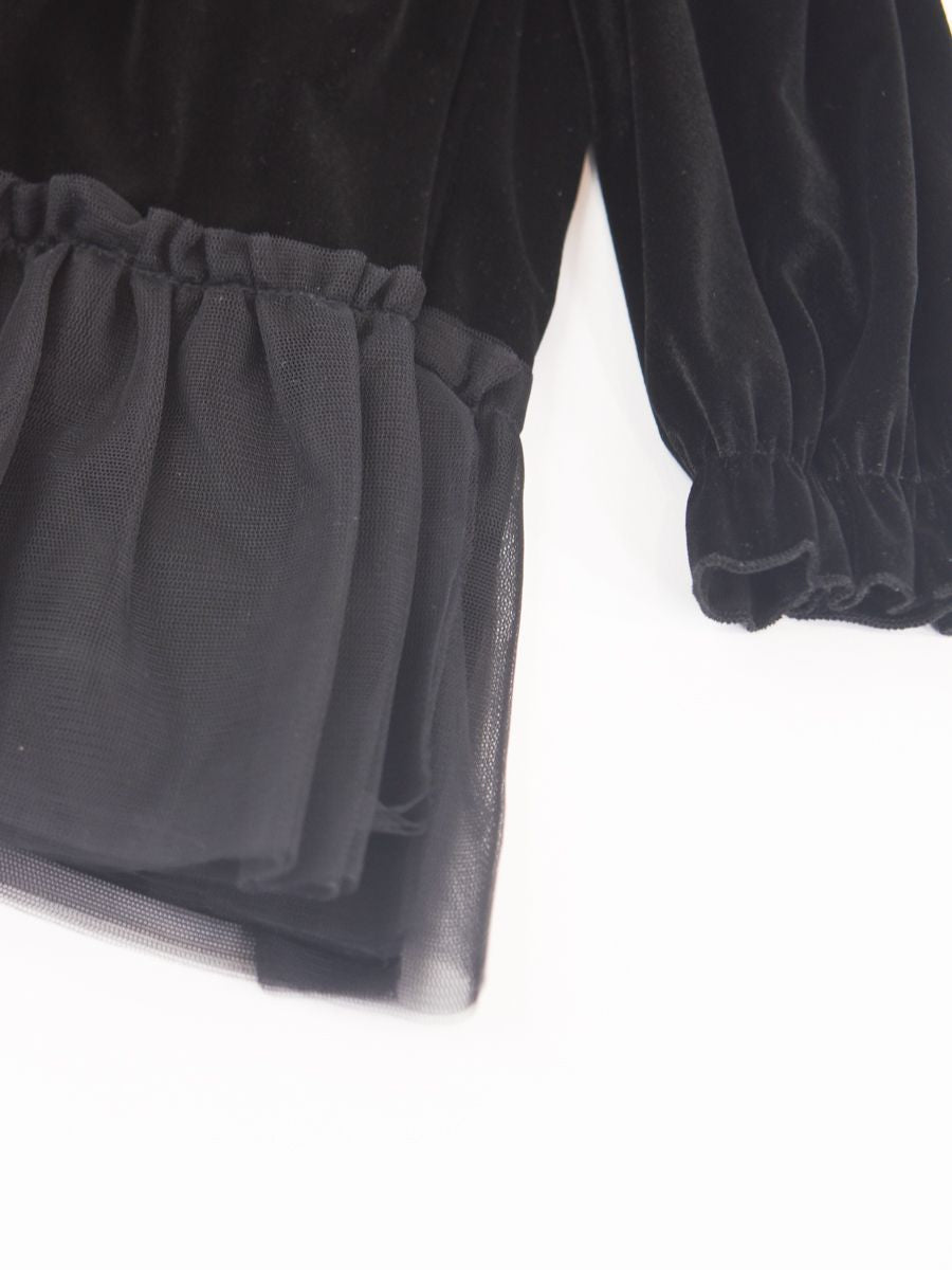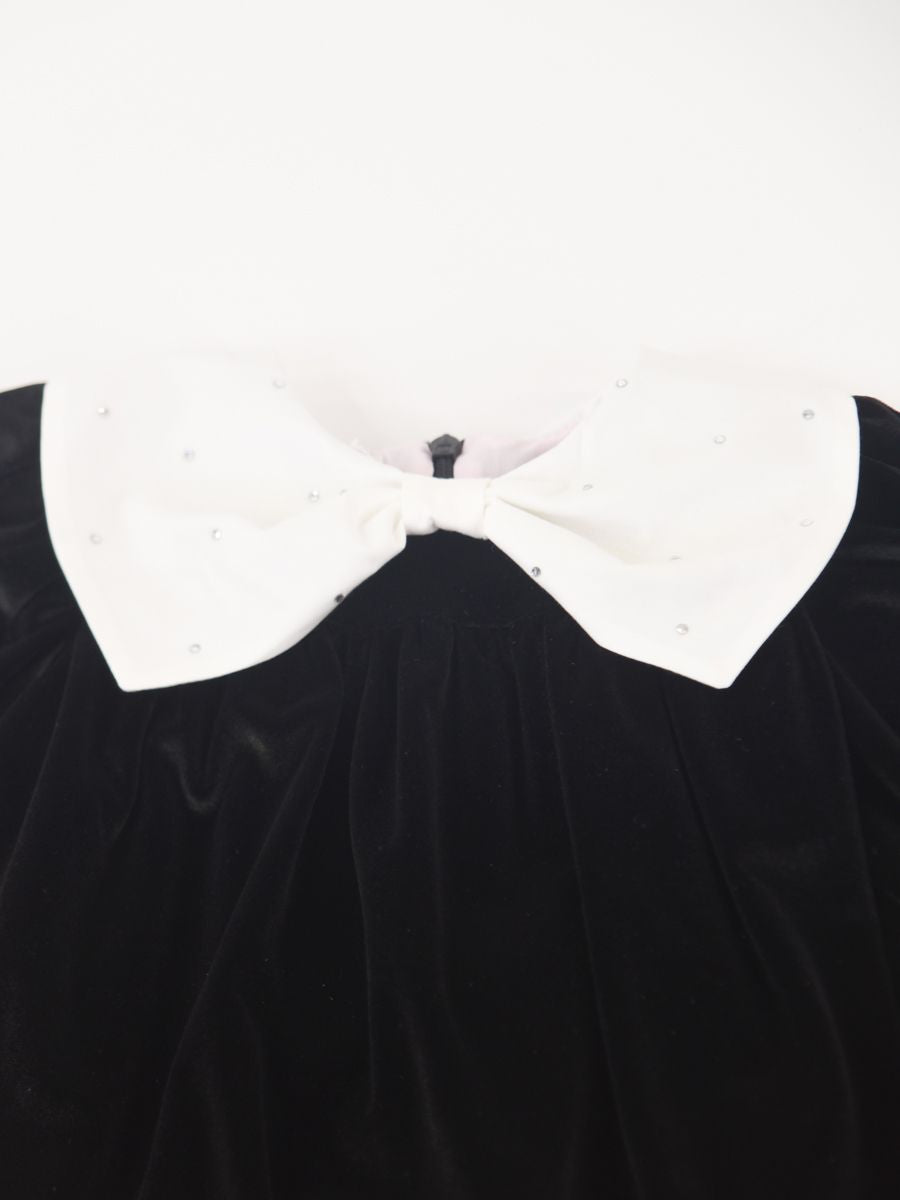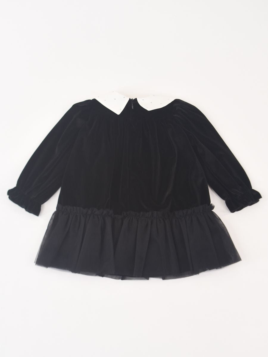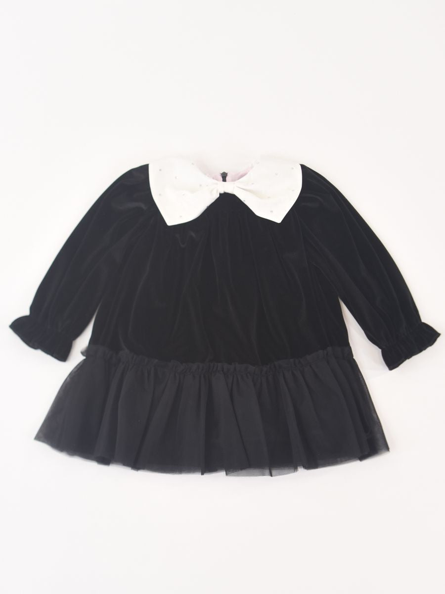 Abito in velluto elegante e sobrio con collo largo a fiocco con applicazioni. Manica lunga con polsi elastici. Fondo con tulle. Interno in fodera di cotone. Apertura a Zip posteriore