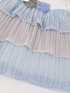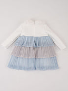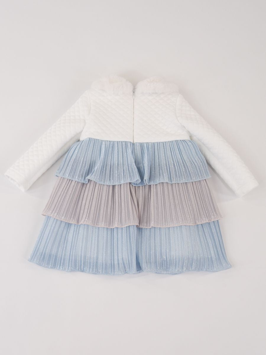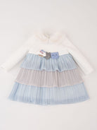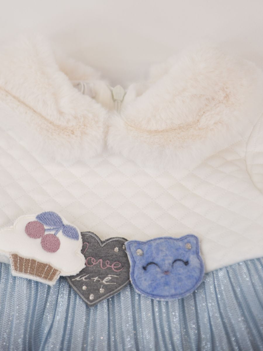 Abito lavorato in vari tessuti per dare un tocco di originalita. Con collo in morbida eco pelliccia. Parte superiore e maniche a trapunta con patch applicati davanti. Dal girovita fino al fondo catterizzato da tulle multicolore Lurex. Interno con tulle bianco e fodera in cotone. antiallergico.Zip posteriore per agevolare la vestibilita