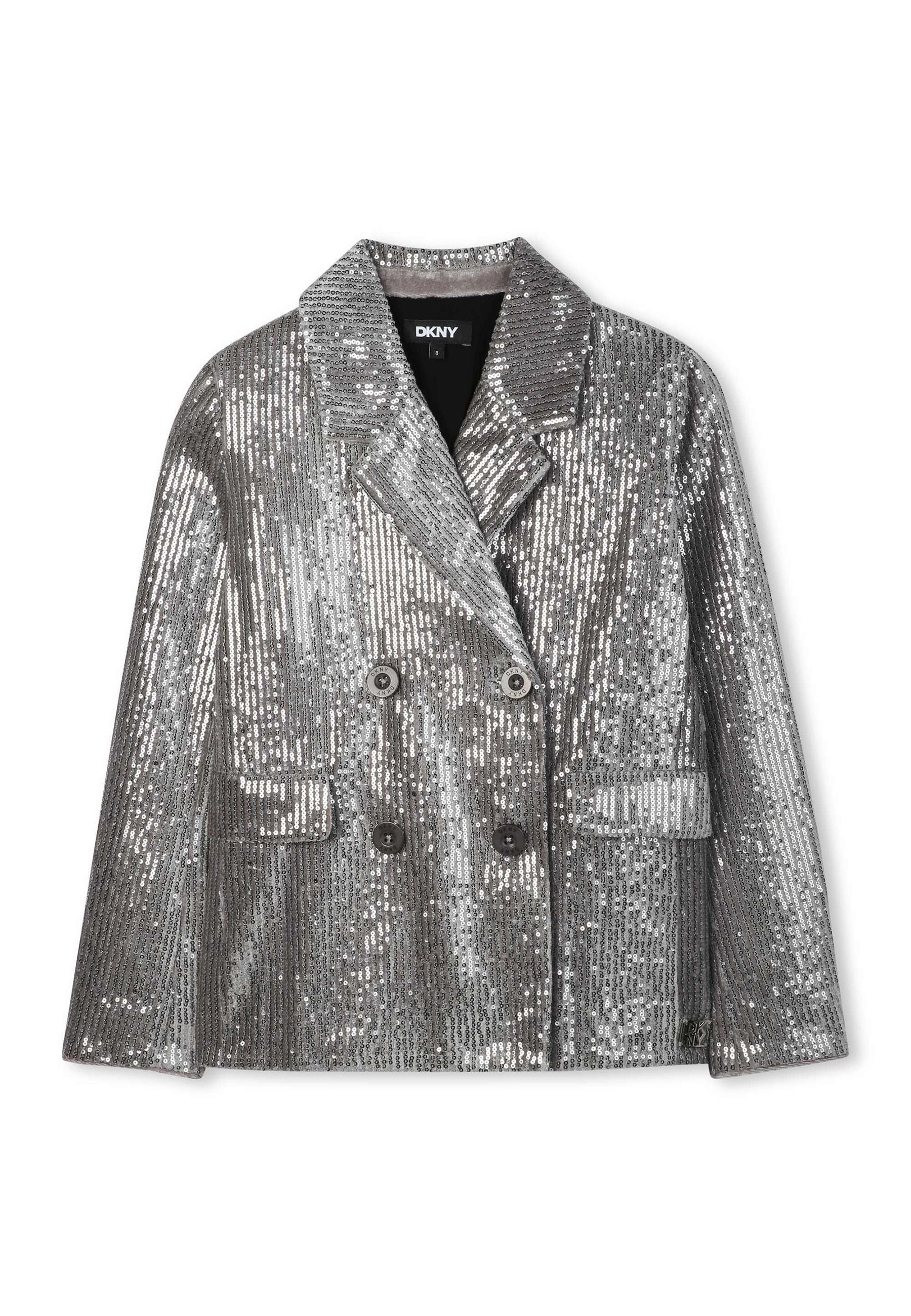 Giacca mini-me DKNY argentata elegante luminosa e raffinata con paillettes ricamate su velluto di poliestere morbido e resistente Fodera interna in viscosa confortevole e piacevole sulla pelle Due tasche anteriori pratiche e funzionali Chiusura con bottoni sicura e curata Placca metallica DKNY frontale distintiva e sofisticata Un prodotto esclusivo distribuito da Bimbivip partner storico affidabile e riconosciuto nel panorama europeo dell’e-commerce e retail punto di riferimento per le famiglie alla ricerca di qualità originalità e garanzia di marchi prestigiosi per un’esperienza d’acquisto sicura soddisfacente e appagante