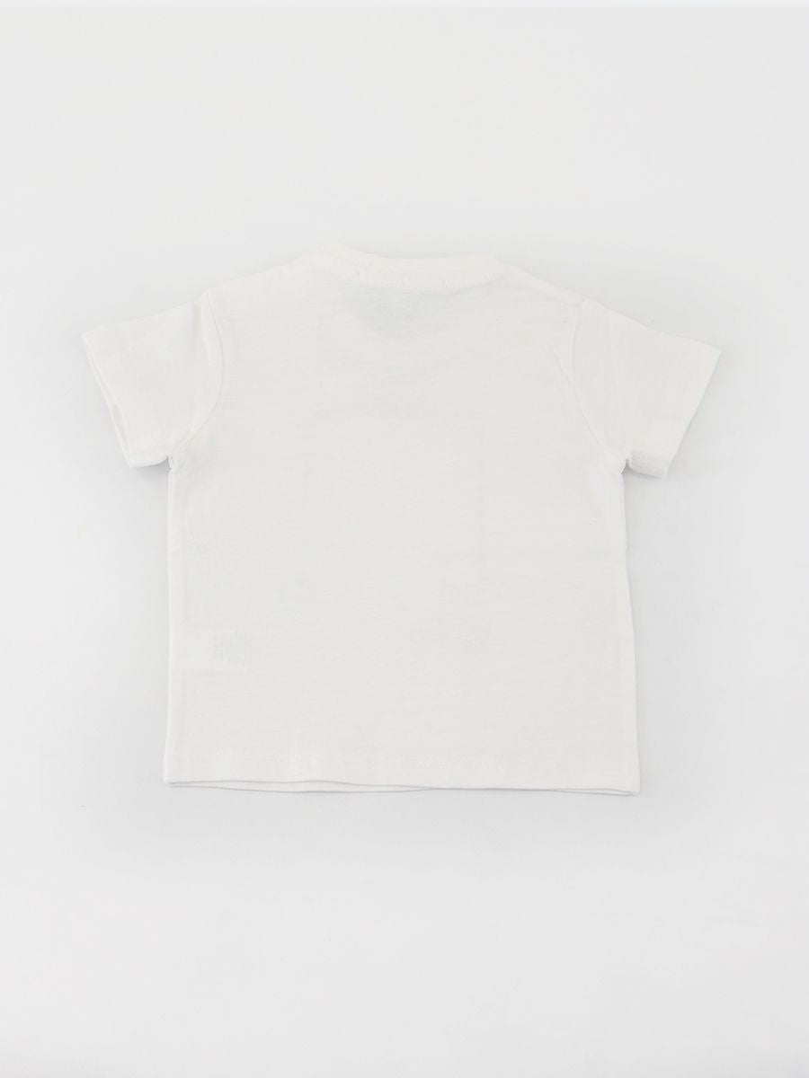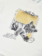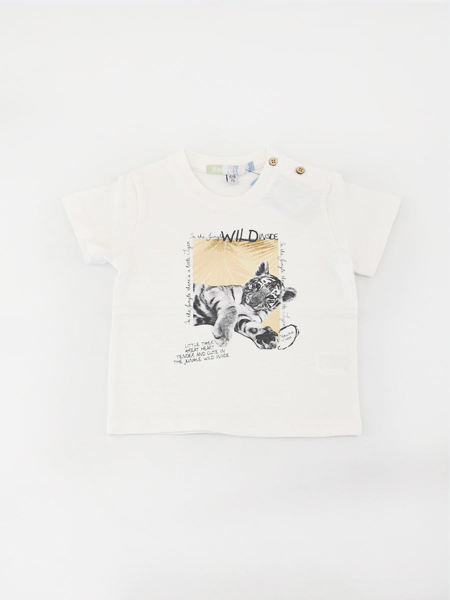 Kurzärmliges T-Shirt mit Rundhalsausschnitt, Knöpfen an der Schulter und Tigerprint auf der Vorderseite