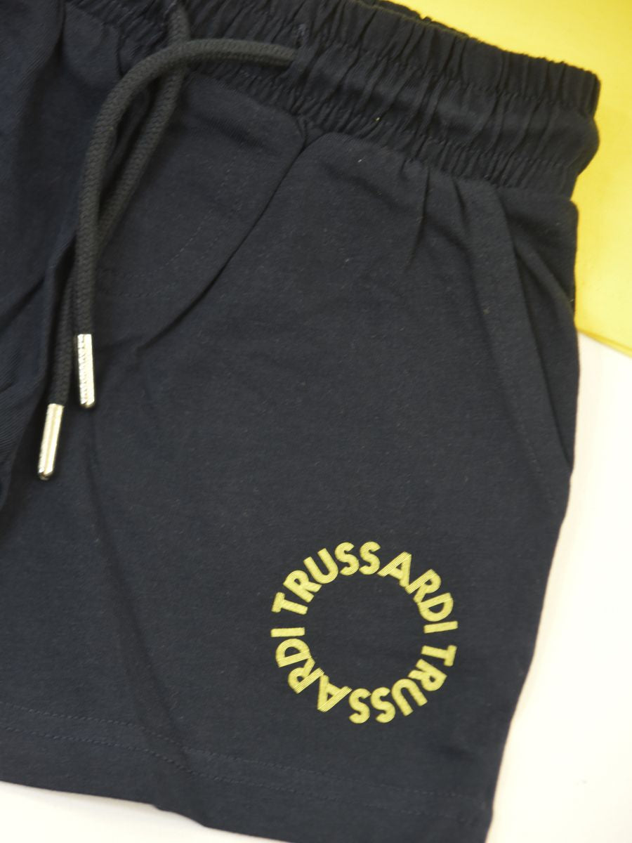 Sportanzug aus weicher Baumwolle. Das Set umfasst kurzärmlige Rundhalsausschnitte mit Markenaufdruck vorne auf der Brust, kombiniert mit bedruckten Bermudashorts mit elastischem Bund und Seitentaschen