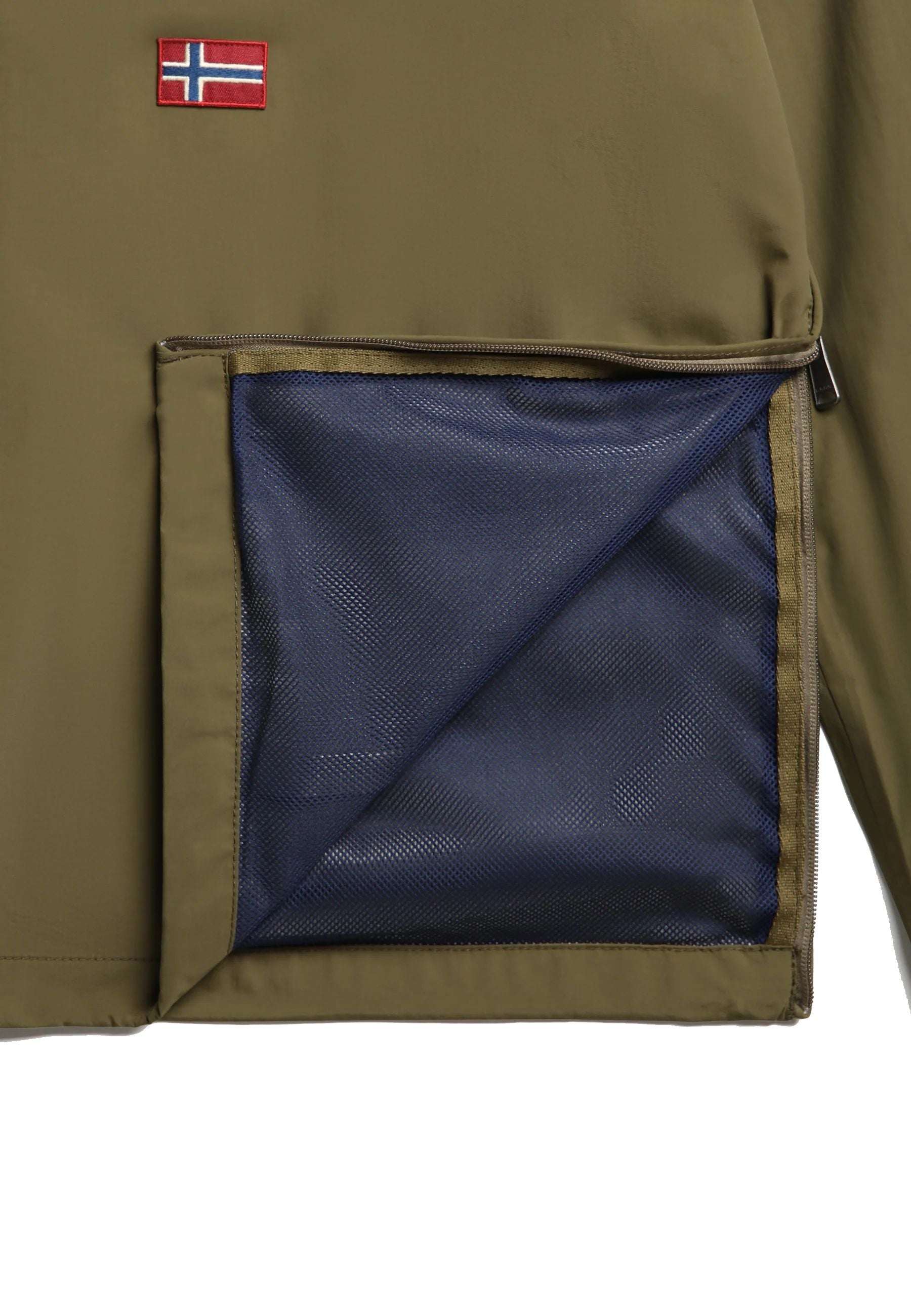Leichte Jacke mit seitlichem und vorderem Reißverschluss. Innenliegende Pattentasche mit Mesh-Futter. Innenliegende Bündchen und verstellbarer Saum sowie versiegelte Nähte