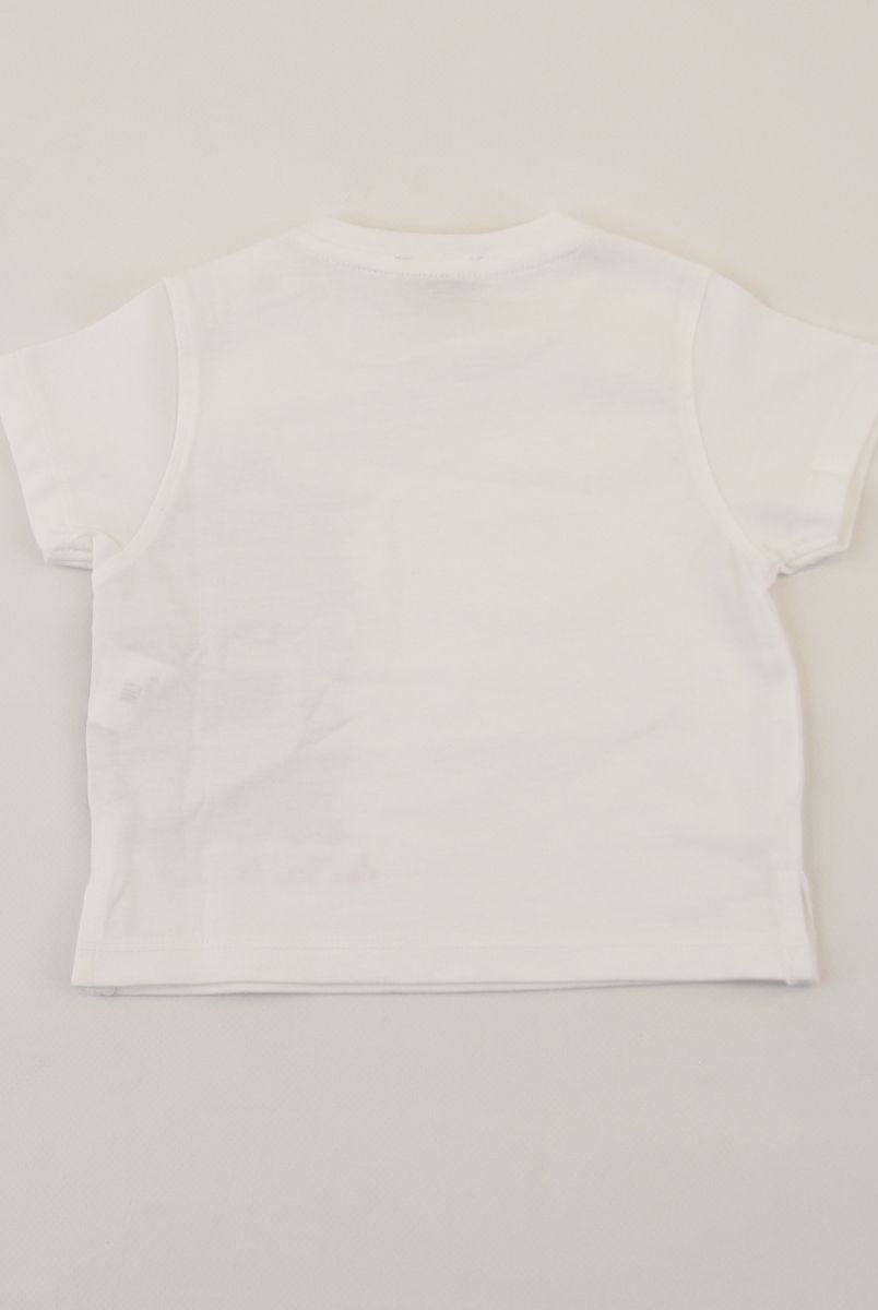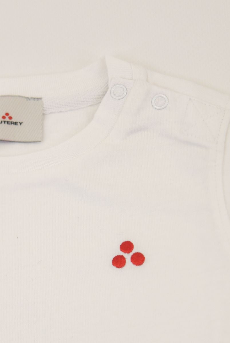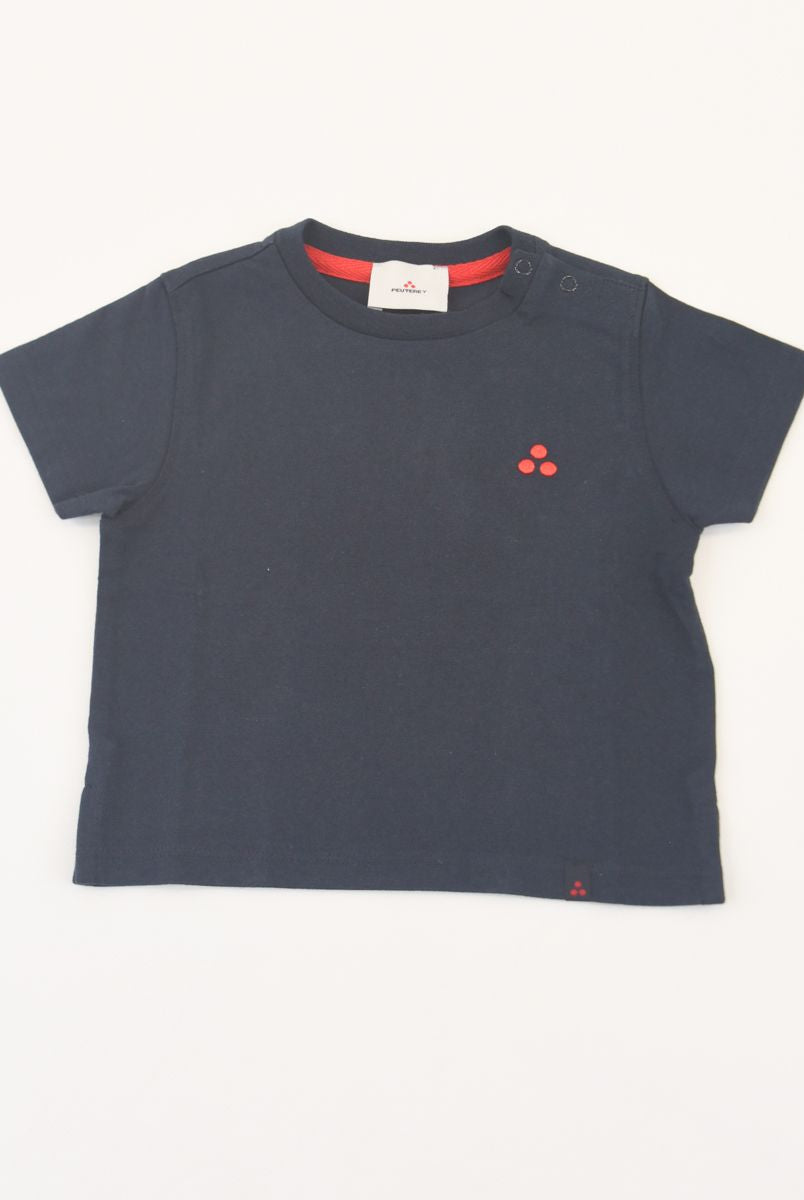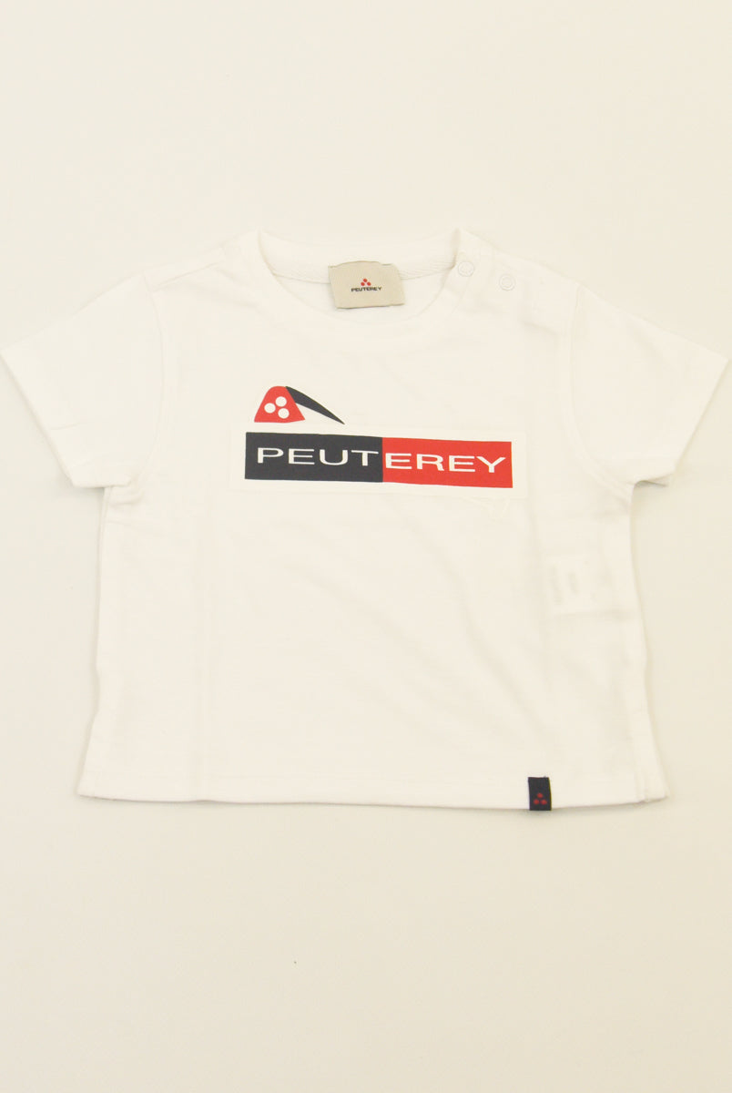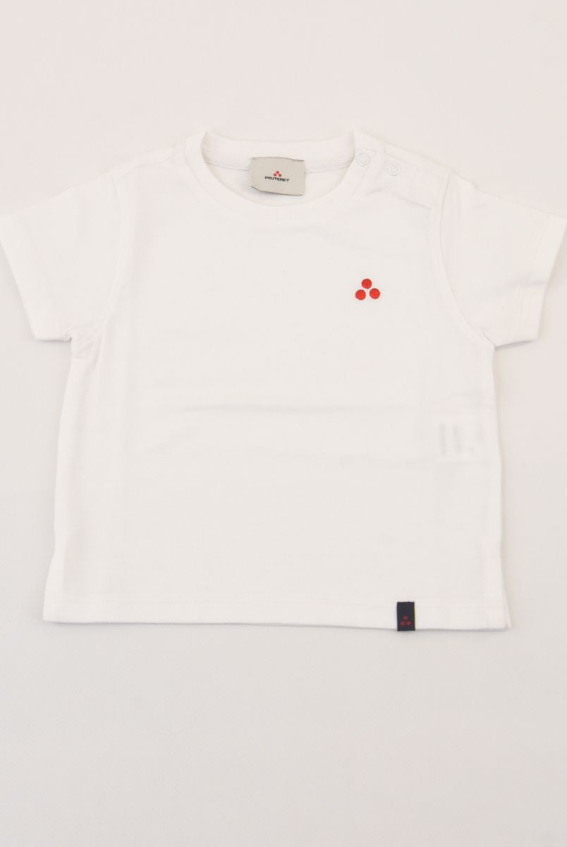 Kurzärmliges T-Shirt mit Rundhalsausschnitt und Logo-Print vorne. Druckknöpfe an der Schulter