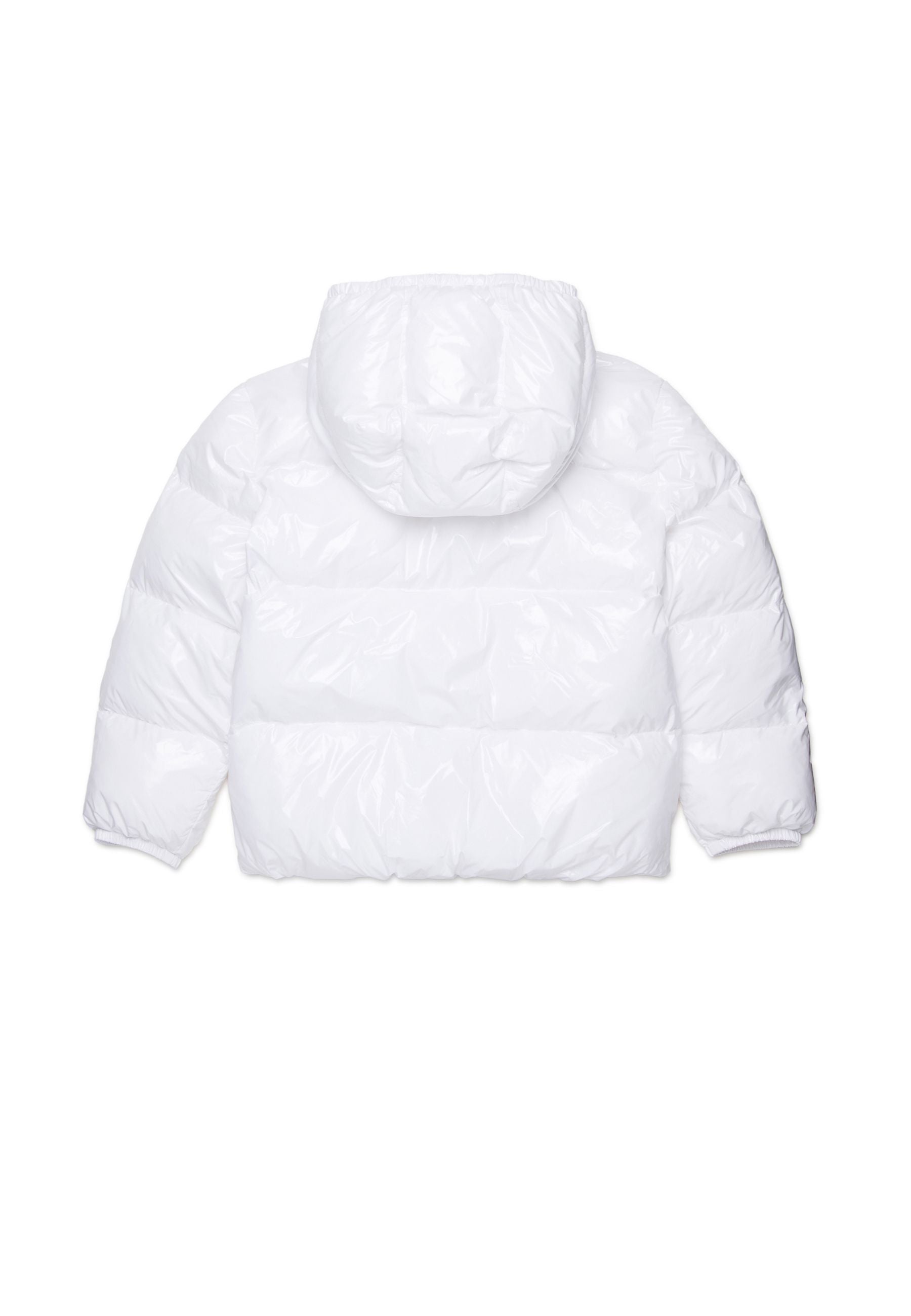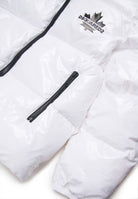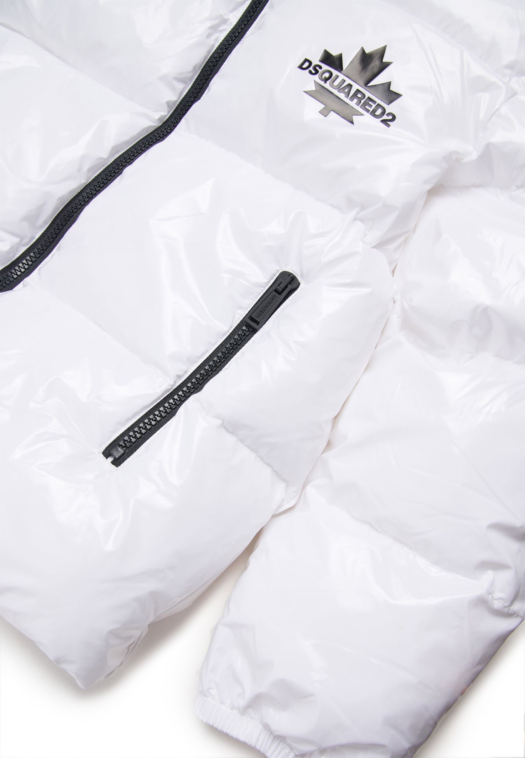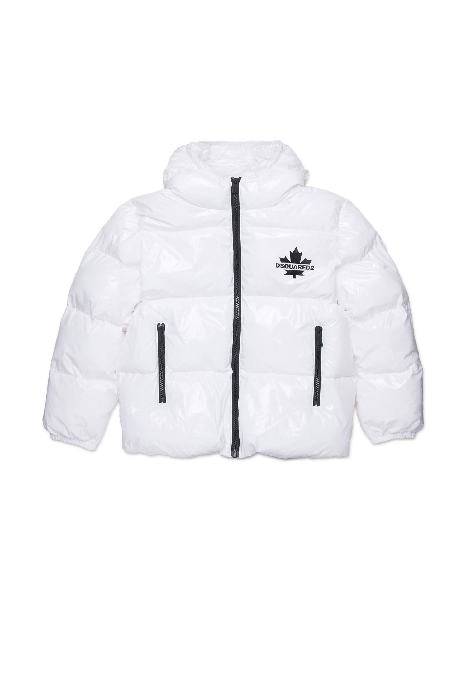 Giubbino Piumino Dsquared2 Kids Junior bianco in nylon lucido con cappuccio e dettagli neri esclusivo elegante raffinato funzionale imbottito e trapuntato orizzontalmente con chiusura a cerniera centrale e tasche laterali discrete cappuccio protettivo e passanti elastici in vita e giromanica per vestibilità perfetta logo icon DSQ2 sul petto in contrasto colore cerniere nere sofisticate e resistenti distribuito da Bimbivip partner storico affidabile e riconosciuto nel panorama europeo dell’e-commerce e retail punto di riferimento per le famiglie attente alla qualità originalità e garanzia di marchi prestigiosi per un’esperienza d’acquisto sicura soddisfacente e appagante