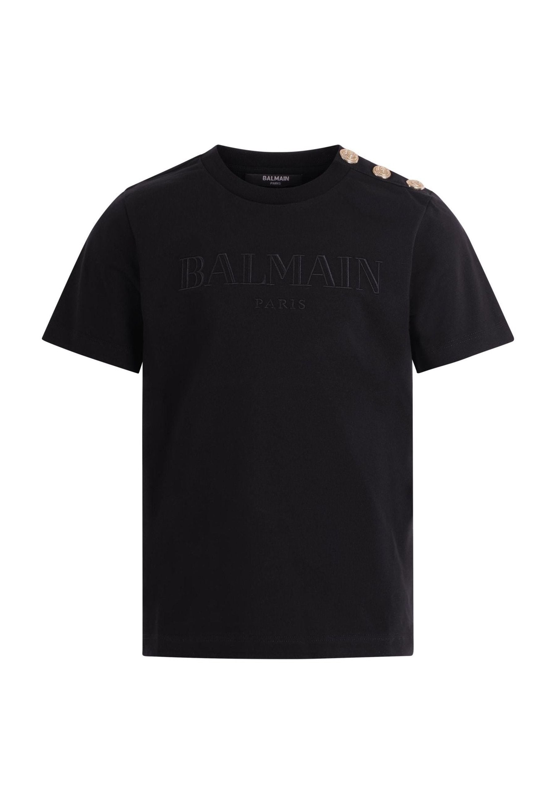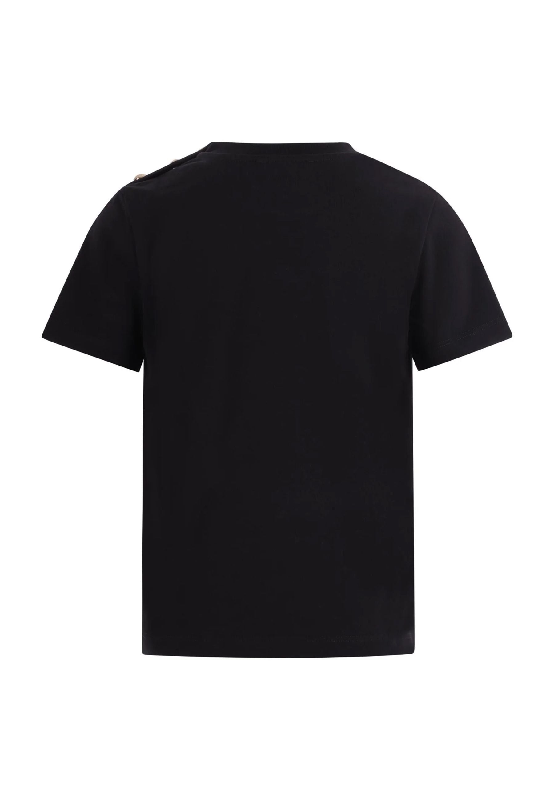 T-shirt nera con logo nero stampato sul davanti e bottoni decorativi color oro sulla spalla sinistra. È un capo in jersey di cotone caratterizzato da un girocollo a costine maniche corte e orlo dritto