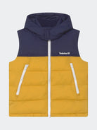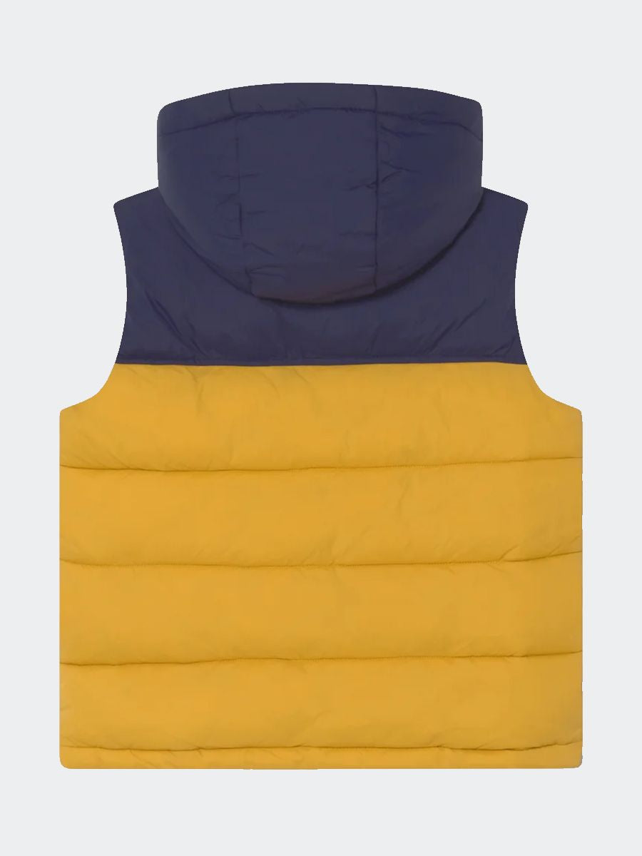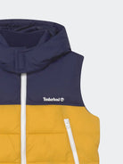 Zweifarbige Daunenjacke mit durchgehendem Reißverschluss und abnehmbarer Kapuze. Gepolstert mit seitlichem Herzdruck und Reißverschlusstaschen