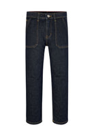 Jeans presentano un taglio largo con una vita regolare. Questo modello è fatto di denim lavato. Le gambe sono ampie e la chiusura è dotata di bottoni e cerniera. Sono dotati di tasche a fessura. Il tessuto dei jeans è stato lavato con pietre per un effetto usurato. La composizione del materiale è 79% cotone 20% cotone riciclato e 1% elastan