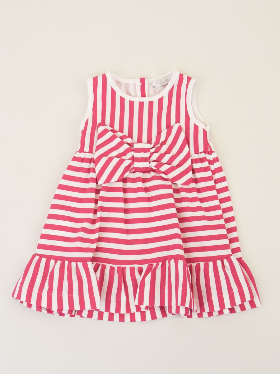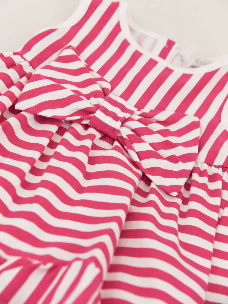 Abito MODELLO SMANICATO CON FIOCCO FRONTALE FANTASIA A RIGHE A CONTRASTO FUXIA E BIANCO